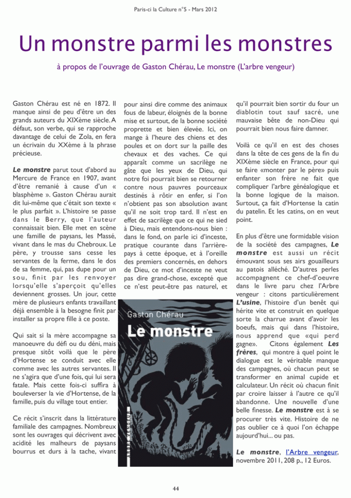 Avec Gaston Chérau le monde paysan recèle des tragédies prisonnières de la glèbe. Son chef- d’œuvre monstrueux, superbement écrit, a survécu à l’effondrement d’un monde et sidère en nous les descendants lointains de ces rustres terribles.