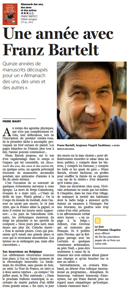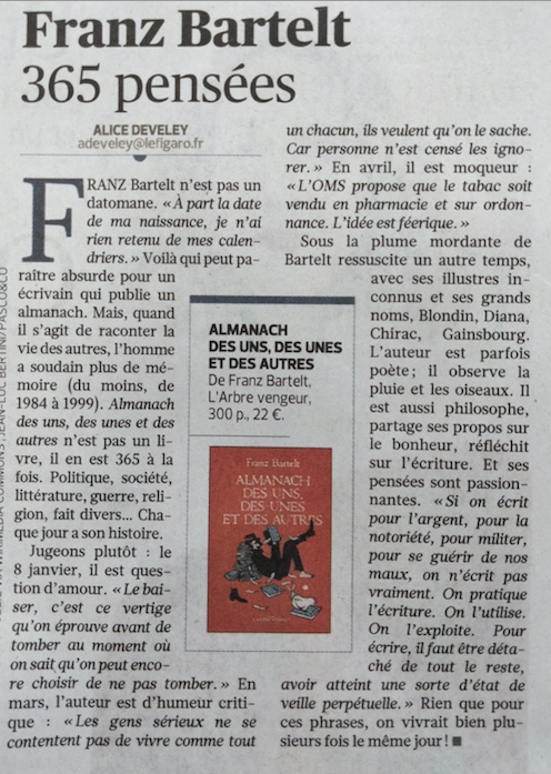 Depuis 40 ans, Franz Bartelt consacre sa vie exclusivement à l’écriture (avec des pauses en Belgique pour goûter bière et frites locales). Il remplit chaque jour que Dieu lui donne ses “cahiers” qui s’accumulent et dans lesquels il puise des romans, des nouvelles, des pièces, des chroniques qui deviennent des livres. Mais il compose aussi une sorte de journal au long cours dans lequel il raconte par le menu ce que la vie et les gens lui inspirent, sorte d’exercice, de pratique assidue, qui est comme le métier du tisserand. Cette œuvre énorme (des milliers de pages), nous en proposons pour la première fois des extraits que l’auteur a organisés sous forme d’almanach, chaque jour d’une année différente (jusqu’à l’an 2000) déclinant une idée, un point de vue, une réflexion. Comme le dit l’auteur lui-même, cet “almanach n’est qu’un assortiment de fictions, d’histoires drôles ou pas, de fables à moralité, de paraboles quasiment évangéliques et de toutes sortes d’inventions plus vraies que les plus faux des mensonges”.