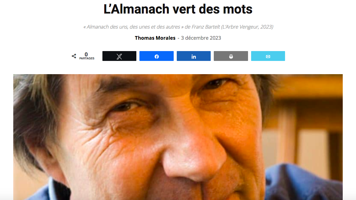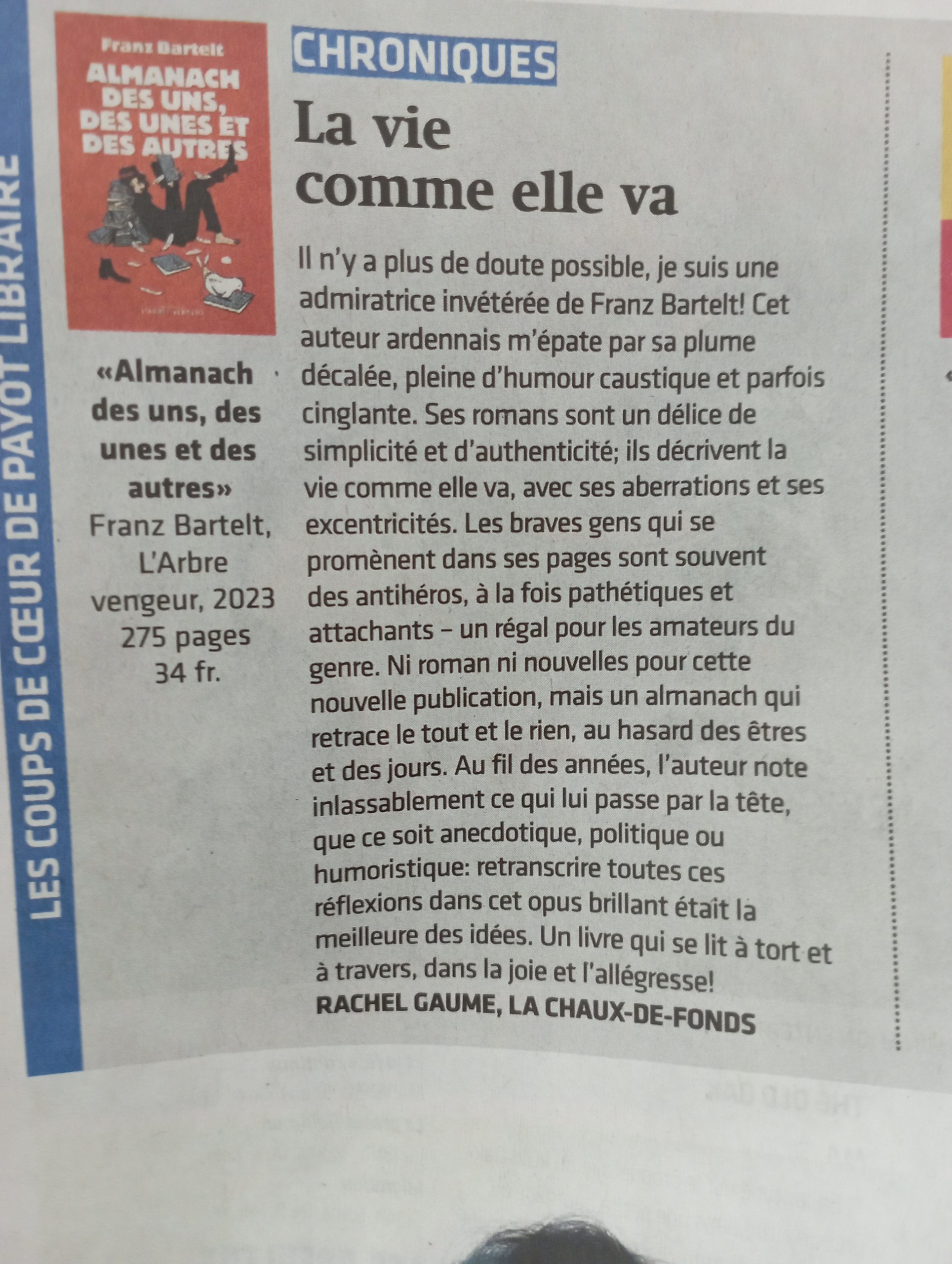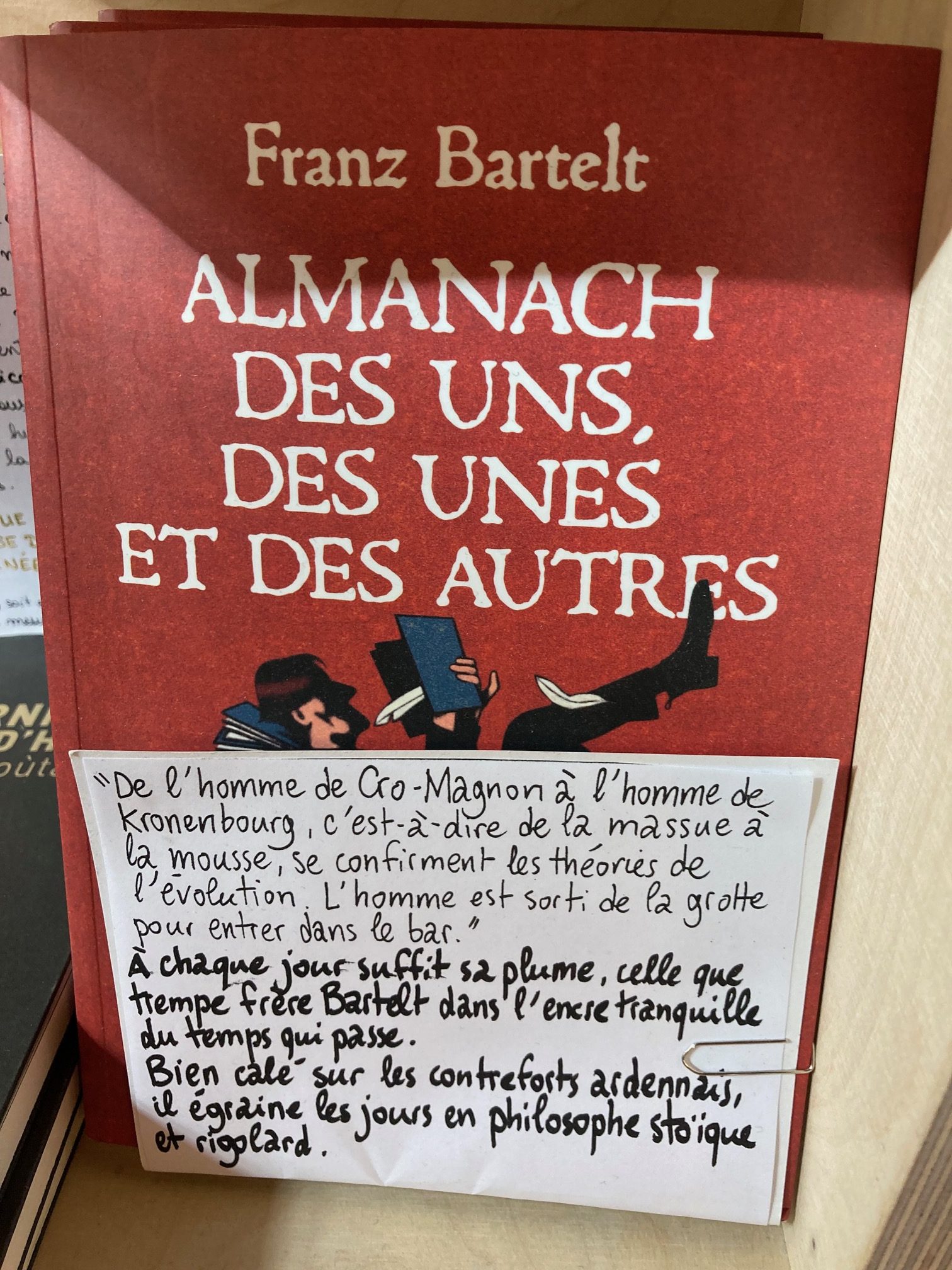 “Réjouissez-vous de passer toute l’année 2024 dans les phrases de Bartelt, d’y puiser chaque jour, votre ration d’étrange, d’amer, de bizarre, de sombre et de banal, et surtout de bancal devrais-je ajouter.”