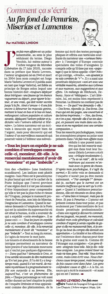 Pour raconter une bonne histoire, nous dit Borges, il faut avoir deux intrigues, une fausse pour égarer le lecteur au départ, et une vraie qu’il faut garder secrète jusqu’à la fin. Cette théorie a trouvé en Mario Levrero, grand auteur uruguayen, un illustrateur hors pair. Avec J’en fais mon affaire il nous embarque dans les aventures, à la fois cocasses et étranges, d’un écrivain en déroute chargé d’en retrouver un autre, un certain Juan Pérez, dont on ne connaît que le manuscrit génial et la bourgade d’origine, un lieu paumé où notre enquêteur amateur va aller de découvertes en déconvenues. Car si les Juan Perez ne manquent pas, ils n’écrivent guère…