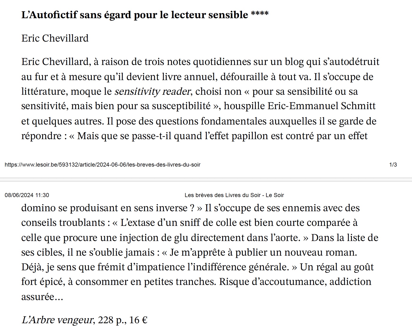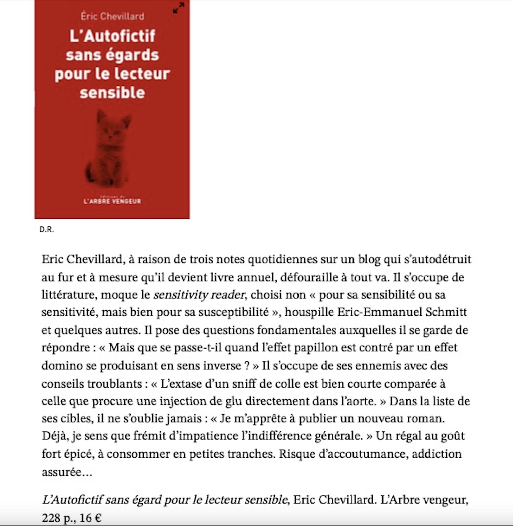 “La publication de son journal découpé en notations éparses, L’Autofictif en quatorze recueils parus aux éditions de l’Arbre vengeur, a achevé de me prouver que je me fourrais le doigt dans l’œil, comme dit San-Antonio, “jusqu’à pouvoir me gratter l’omoplate par l’intérieur”. Chevillard est d’évidence un des grands écrivains de notre temps, à la fois génie de l’aphorisme et surdoué du non-sens, et surtout un observateur très fin des dérives grotesques de notre monde et de la fin de la littérature .”