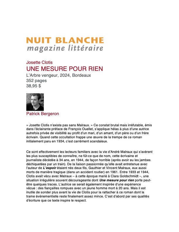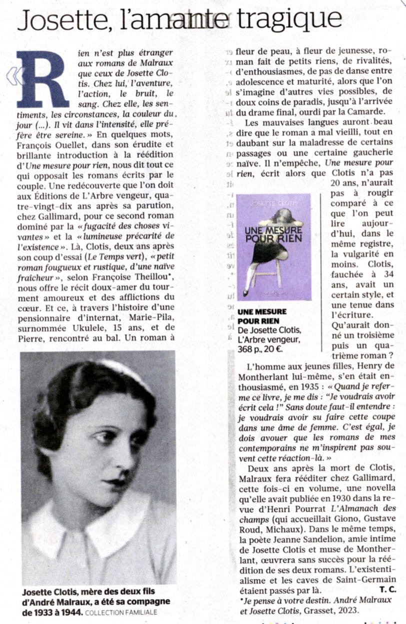Avec ce modeste argument qu’on pourrait trop vite juger classique voire simplement sentimental, Josette Clotis, météorite oublié de l’avant-guerre, a réussi le tour de force de composer un roman d’amoureuse initiation qui mêle poésie et mélancolie, cruauté et inquiétude, profondeur et légèreté, saisissant les remous d’une jeune conscience agitée par des sentiments inconnus.
