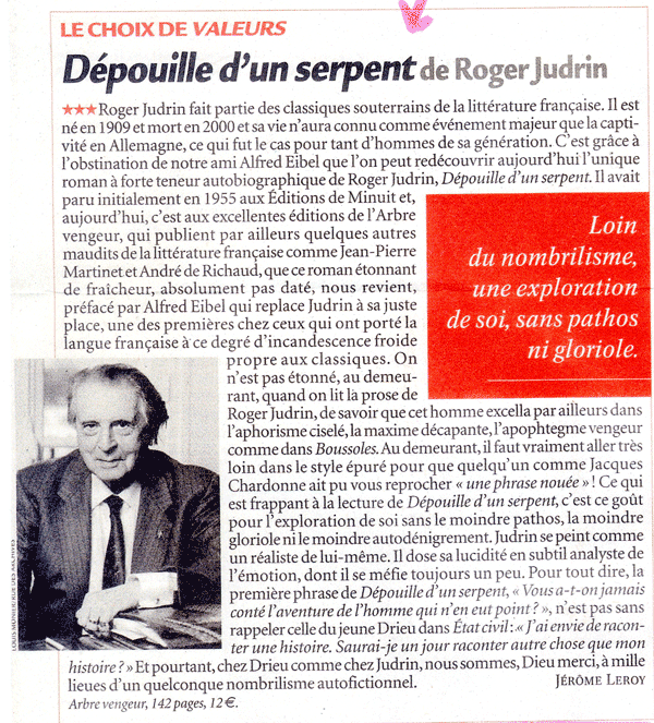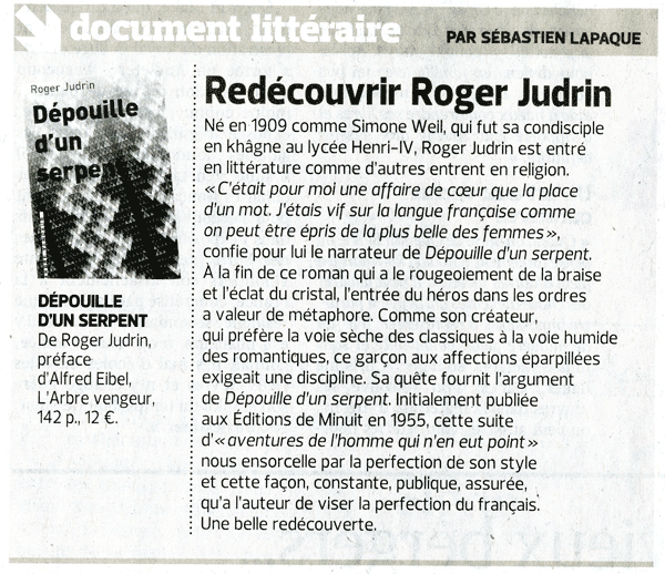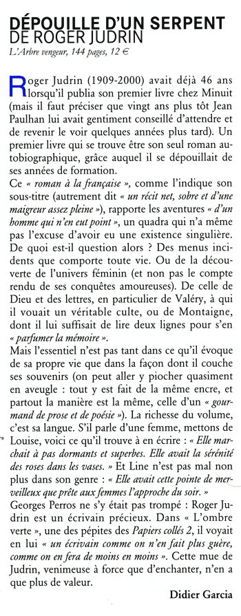 Jean Paulhan avait dit au jeune Roger Judrin : « revenez me voir dans vingt ans ». À la date prévue il est venu, ponctuel, et porteur de ce livre qui confirma à l’éditeur qu’il avait vu juste. Avec ce roman, l’auteur s’engageait dans un chemin littéraire unique, distillant une prose aussi riche qu’abrupte dont les défenseurs sont désormais aussi rares qu’ardents.