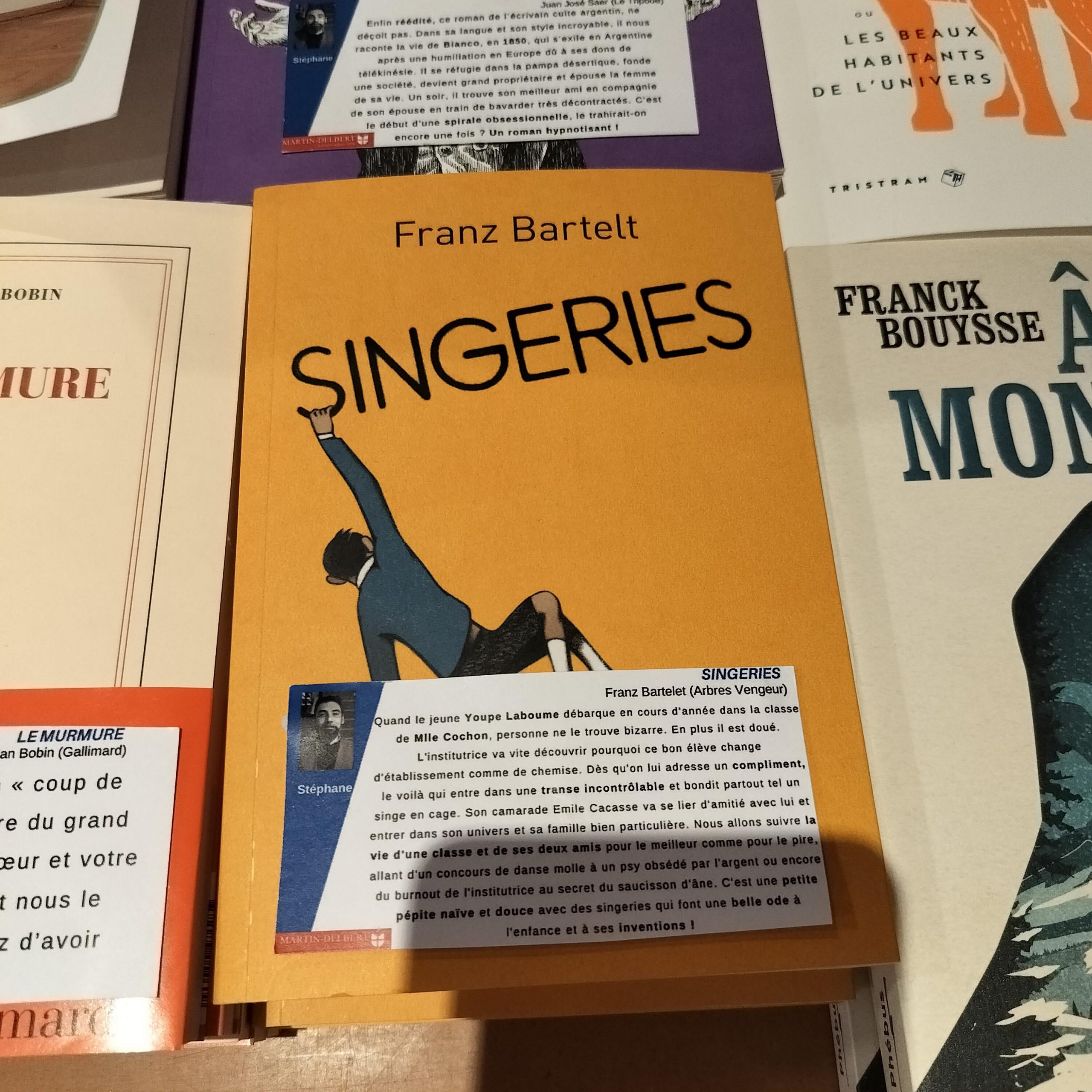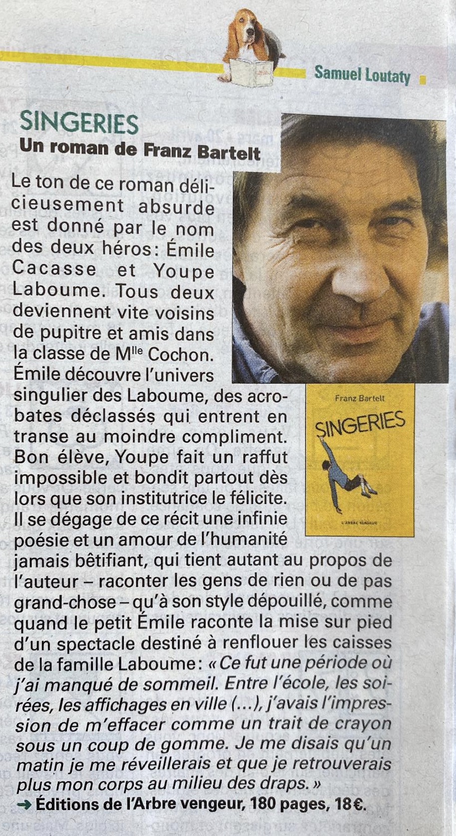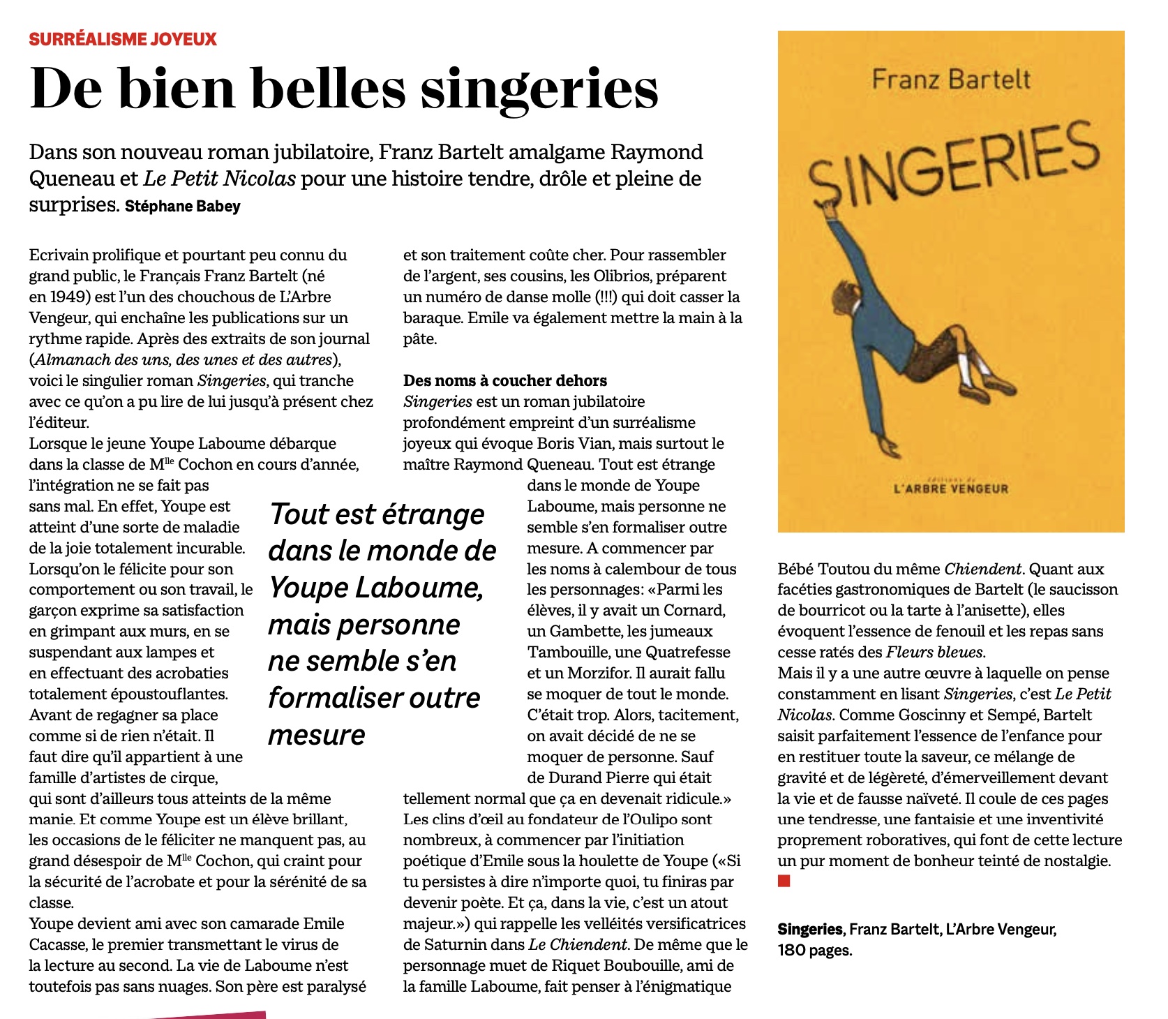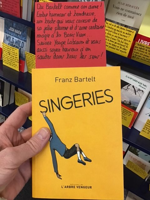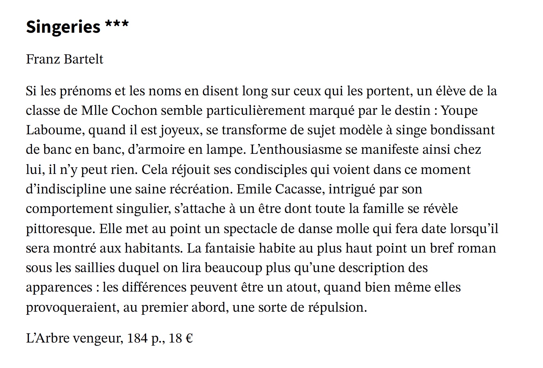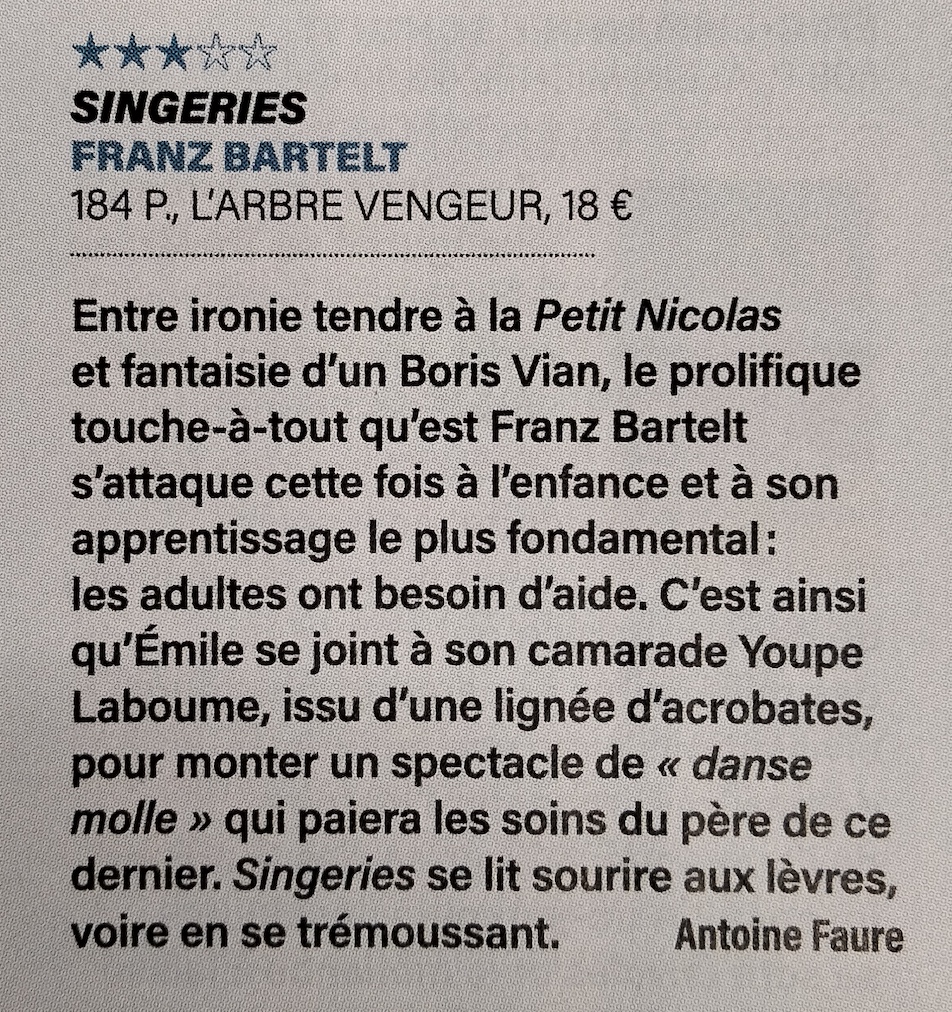 Si l’on retrouve dans ces pages sautillantes l’inimitable verve de Franz Bartelt, seul écrivain capable d’imaginer un numéro de « danse molle », on y découvrira un monde enfantin dont la douceur et la naïveté viennent tempérer des singeries qui nous font bondir de joie.