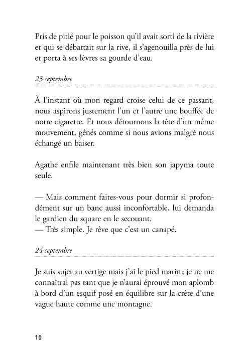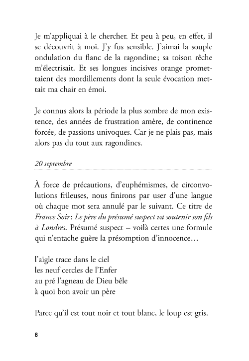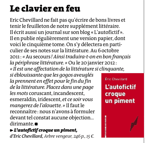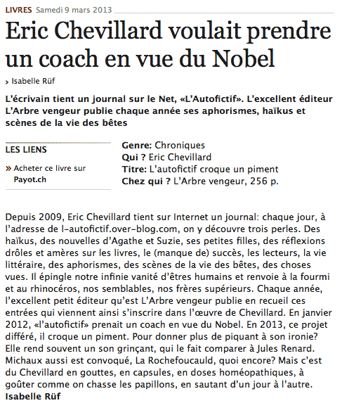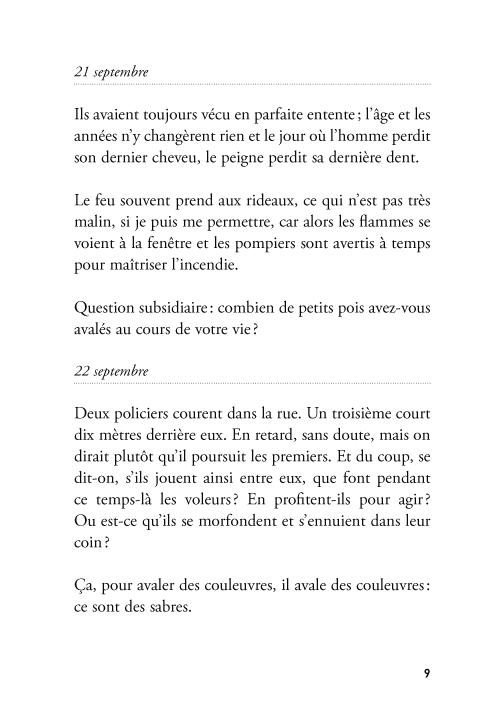 « C’est Jules Renard, Pascal et La Rochefoucauld réunis, et encore plus que ça. Les petits faits de la vie, de menues observations mis en formules gnomiques et transfigurés par l’invention, l’humour, la fantaisie. Autre chose que la morne liste des courses qui fait l’ordinaire de ce qu’on nomme autofiction, sans doute pour signifier que ça exclut toute inventivité. »