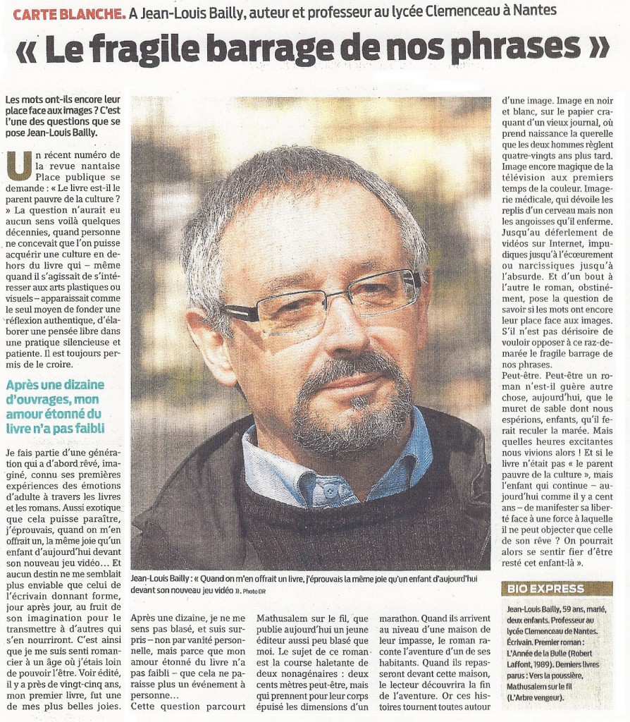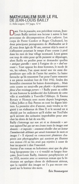 “Jean-Louis Bailly (…) montre avec ce nouveau roman que la littérature est quelque chose de drôlement sérieux, que la rapidité des images ne l’a pas encore emporté sur la lenteur des mots.”
