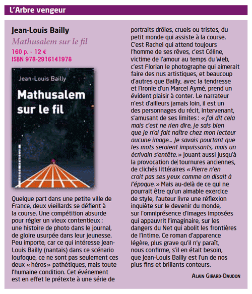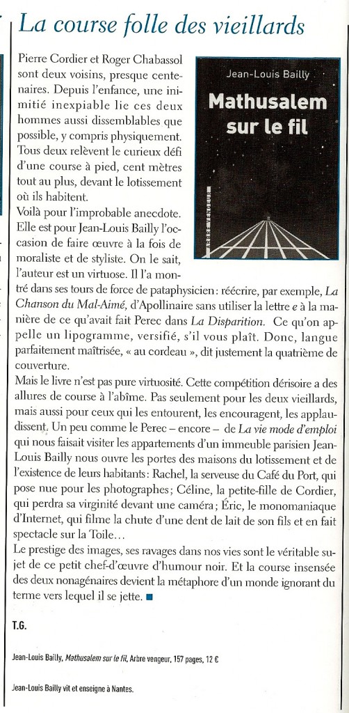 “Ce roman d’apparence légère, plus grave qu’il n’y paraît, nous confirme, s’il en était besoin, que Jean-Louis Bailly est l’un de nos plus fins et brillants conteurs.”