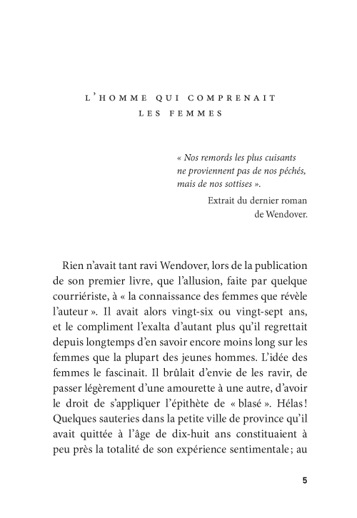 « Il naît de temps à autre un homme qui connaît instinctivement l’esprit féminin », se dit Wendover quand il découvre qu’on loue la profondeur psychologique de ses romans. Une chance véritable que cette connaissance instinctive… car le jeune auteur, en fait d’expérience, n’en a aucune et ne comprend pas pourquoi ce qui marche si bien dans ses œuvres n’est d’aucun secours dans la vie réelle.