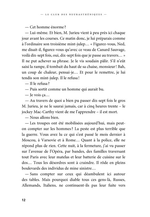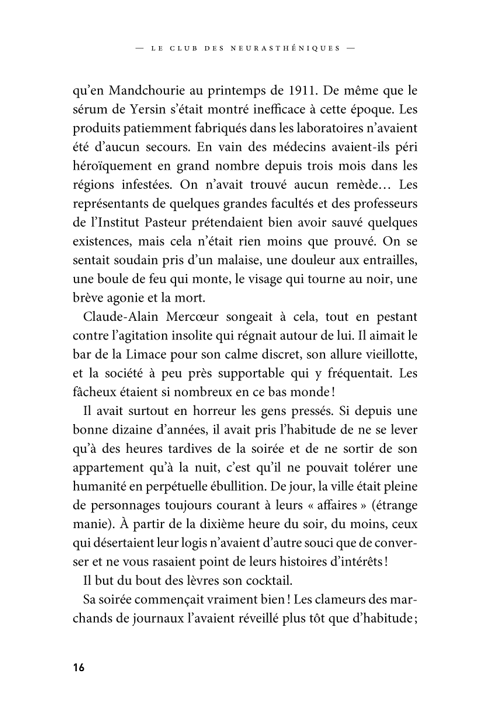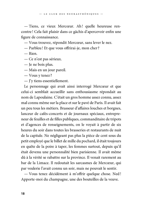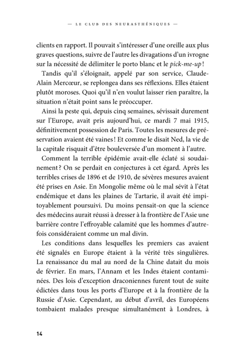 Réunis au sein d’un club qui a érigé la neurasthénie en mode de vie, une poignée de résistants aux conventions, snobs parisiens qui ont renoncé à trouver un sens à l’existence, vont s’embarquer dans une expédition à laquelle rien ne les préparait. Animés par la plume malicieuse de l’un des plus brillants espoirs littéraires fauchés par la Grande Guerre, ils deviendront les héros improbables d’un roman qui joue d’humour et d’exotisme pour mieux nous emmener dans les grandes prairies de la fiction chères à Stevenson, Verne ou Conrad.