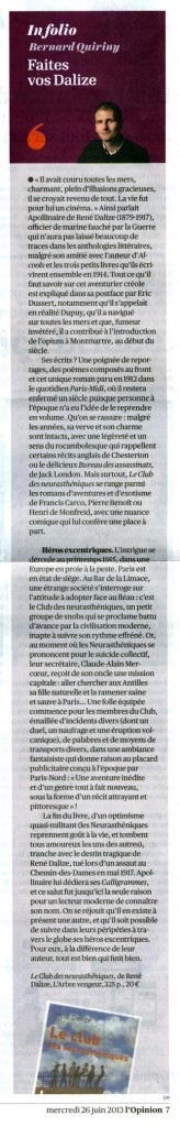 “(…) une verve et un charme intacts, avec une légèreté et un sens du rocambolesque qui rappellent certains récits anglais de Chesterton ou le délicieux “Bureau des assassinats”, de Jack London.”