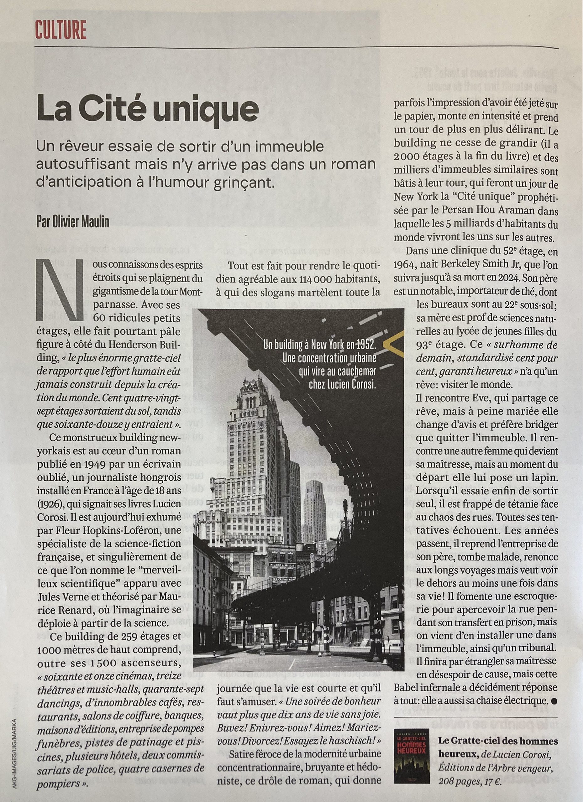 Pourquoi courir la campagne et le monde quand on peut tout trouver, y compris le bonheur, dans un immeuble parfaitement autosuffisant ? Le gratte-ciel new-yorkais qui s’élève fièrement dans ce roman se veut une société idéale à même de satisfaire les moindres désirs de ses 114 000 habitants peu soucieux de s’en éloigner : 259 étages, 500 ascenseurs pour 1000 mètres de haut, doté d’une économie circulaire, il possède ses institutions religieuses et judiciaires.