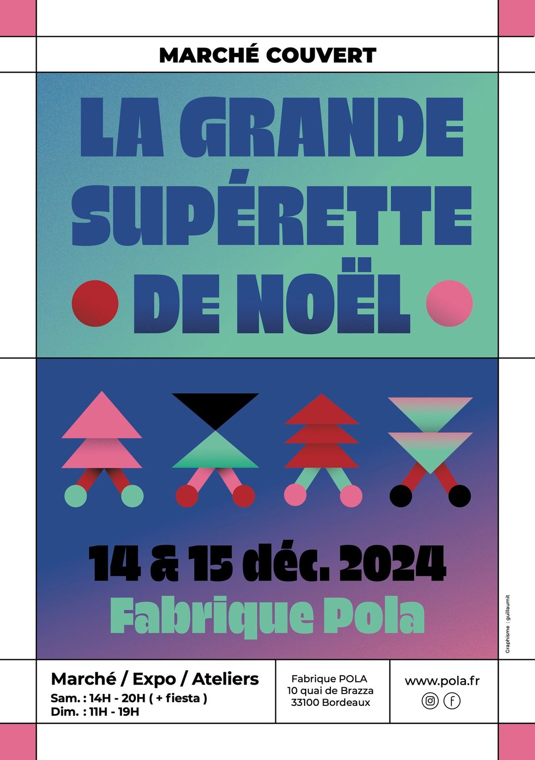 La Supérette de Noël à la Fabrique Pola c’est le marché de saison le plus foutraque et le plus amusant de la ville où on ne peut plus faire cent mètres sans tomber sur un rassemblement d’artisans encadrés de marchands de (mauvais) vin chaud. Comme chaque année nous franchirons l’arpent qui sépare notre bureau de notre stand pour étaler les richesses inestimables de notre fonds et les beautés éclatantes de nos nouveautés avec le lyrisme qui convient. Nos livres, emplis souvent de morts bizarres, sentent parfois le sapin et la bière y coule à flots, mais c’est en pleine forme, abstèmes et ardents que nous accueillerons un public qu’on voudrait impatient d’offrir des bouquins, la valeur la plus sûre en des temps incléments.