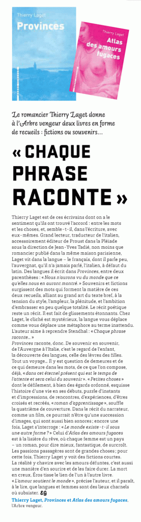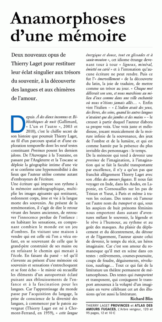 “Deux nouveaux opus de Thierry Laget pour restituer leur éclat singulier aux trésors du souvenir, à la découverte des langues et aux chimères de l’amour.”