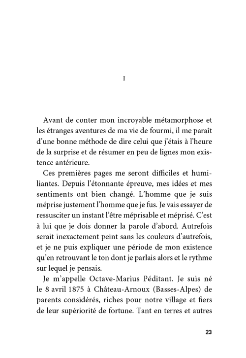 On ne se méfie pas assez des fées, surtout celles qui errent dans les landes désertes et ont tôt fait de vous transformer en fourmi si vous acceptez de les prendre au sérieux. C’est cette aventure hors du commun que le héros de ce livre, tout d’abord incrédule avant de céder à l’émerveillement, va vivre pendant une année. Projeté dans l’univers d’une fourmilière, il découvre la grandeur d’une espèce minuscule dont, revenu au triste monde des hommes, il peinera à traduire les beautés, les intelligences et les héroïsmes.