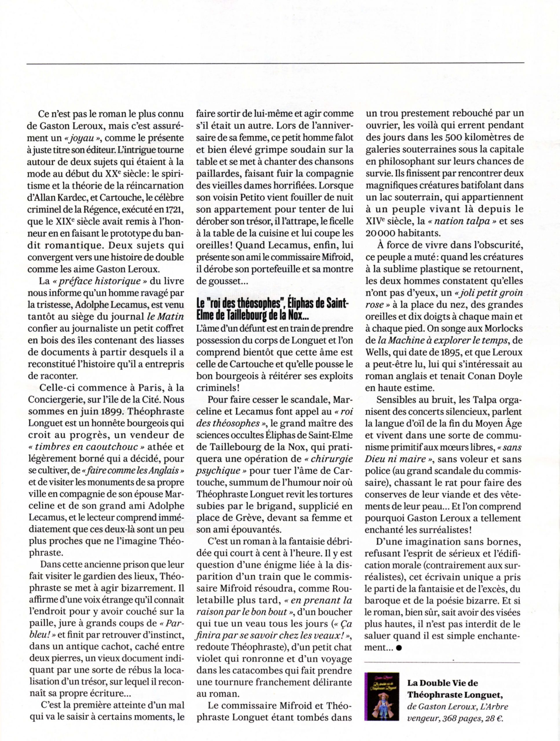 Théophraste Longuet, quadragénaire encore vert, décide de se retirer des affaires. Ce petit-bourgeois convenable veut se consacrer à la culture, trop longtemps délaissée, et entreprend de visiter les monuments de Paris. Mal lui en prend ! Lors de sa visite de la prison de la Conciergerie, on l’entend qui s’exprime de façon fort rugueuse et avec une autre voix que la sienne : une âme errante l’aurait-elle choisi pour se manifester ? Passé l’effroi des premiers jours, tout laisse à penser que son vocabulaire, ses expressions, ses souvenirs sont ceux du terrible Cartouche, le bandit de La Régence, et que celui-ci s’est réincarné dans ce père tranquille qui ne se maîtrise plus et va entraîner son entourage dans des aventures toutes plus folles les unes que les autres.