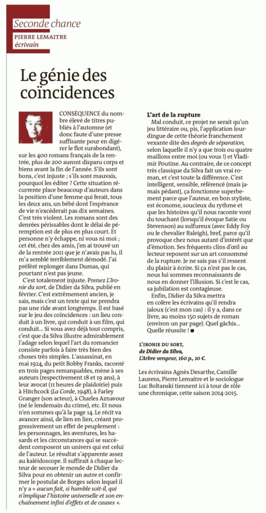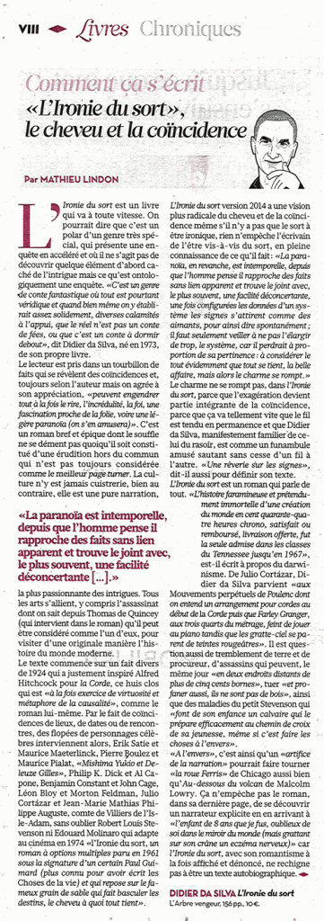 “Ce marabout/bout d’ficelle tissant la concaténation d’événements disparates forme une virtuose sotie pétrie d’absurde. Jubilatoire.”