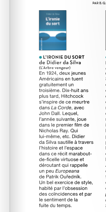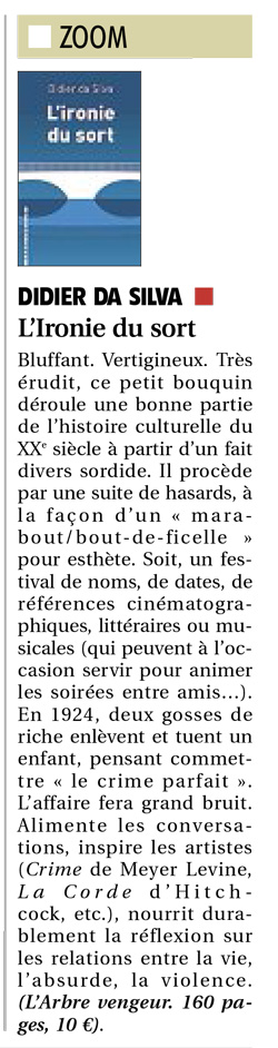 Tout est vrai dans ce livre, ce qui explique la fascination qu’il pourra exercer sur des âmes sensibles à la fiction et oublieuses que le réel nous offre de quoi satisfaire notre soif de fantastique, de sublime et d’horreur. Mais si Didier da Silva n’a rien inventé, il a cependant, avec un brio vertigineux, mis en musique un affolant enchaînement de coïncidences et de correspondances entre des faits, des dates et des personnages : acteurs, artistes, assassins, écrivains… De quoi engendrer un émoi intense, cette impression, comme le disait Stevenson, d’un je-ne-sais-quoi de pathétique au coeur des choses, la jonction de deux éléments : une attraction et un effroi sans borne.