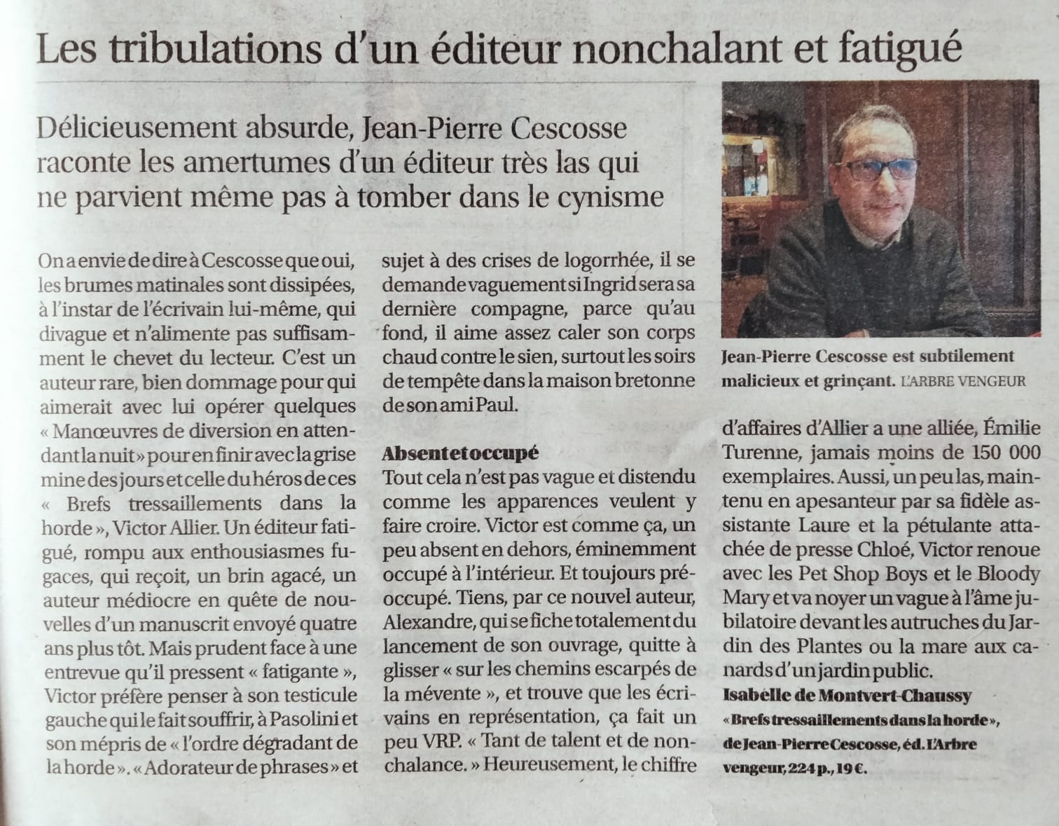 Joyeusement ironique ou désespérément tragique, Jean-Pierre Cescosse s’emploie, avec style et malice, à la rigoureuse et jouissive description d’un milieu littéraire drôlement universel.”