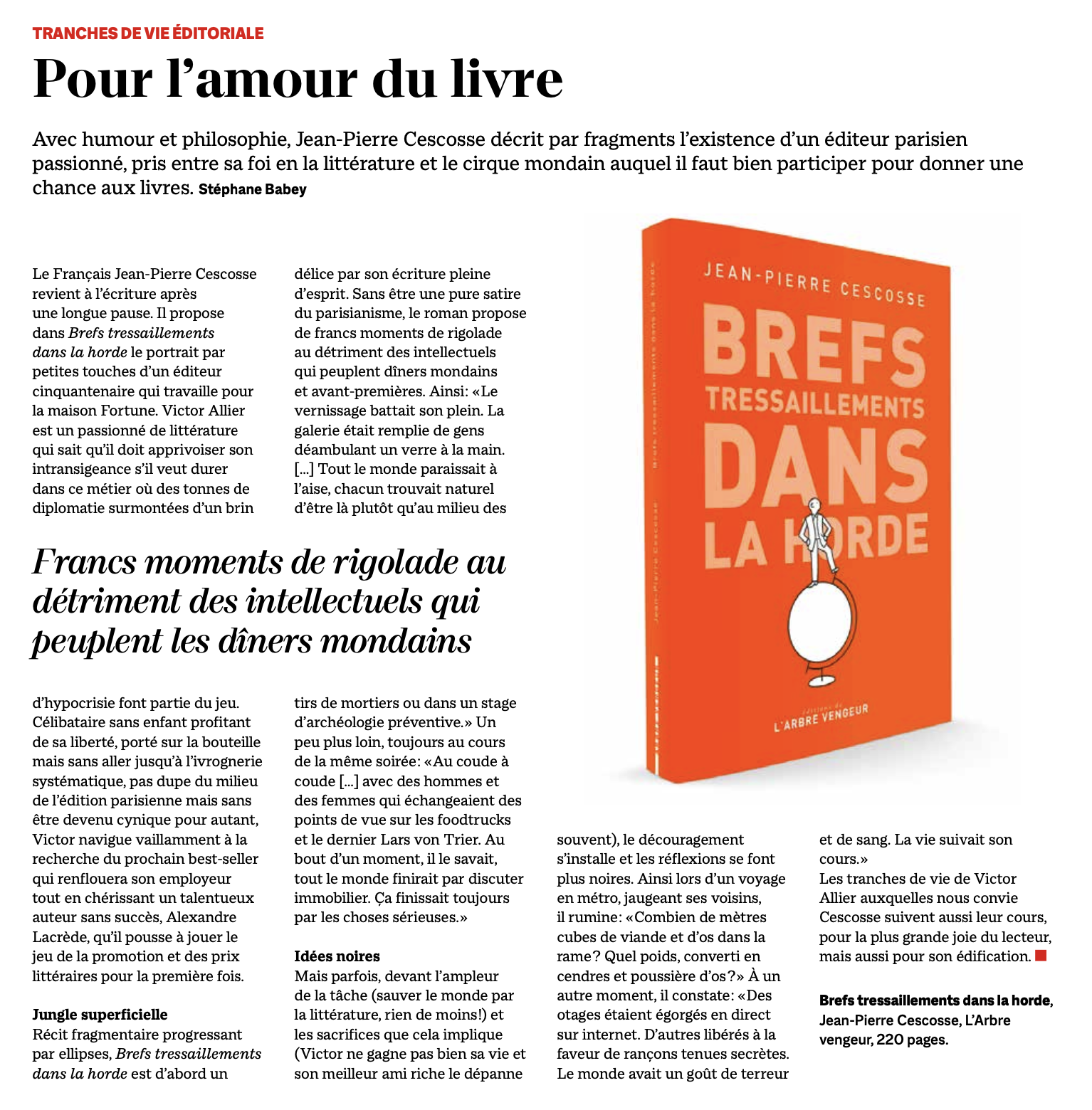 En tissant les fines attaches qui relient entre eux quelques moments de vie dispersés d’un personnage en quête de hauteur, au cœur de cette horde du microcosme éditorial observée avec ironie, Jean-Pierre Cescosse s’est fait le chroniqueur élégant et parfois impitoyable d’une époque inquiète.