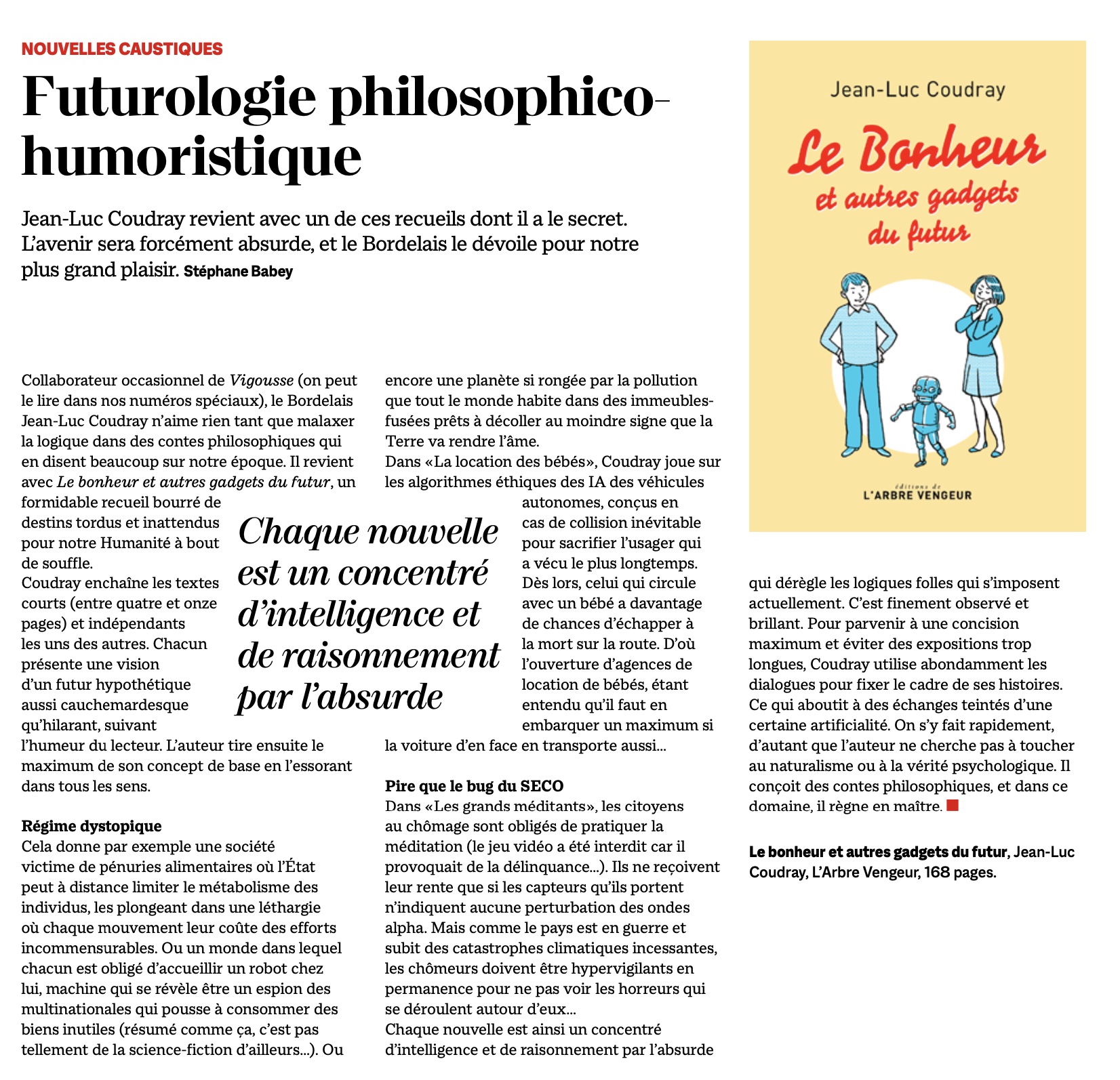 Parcouru de robots intrusifs, de fusées HLM, de bébés à louer, de retours à la préhistoire, de conférences autoritaires, de zoos fantasques, de météorologies cotées en bourse, ou de paradis troublants, chacun de ces mondes s’articule sur une conception bien précise du bonheur.