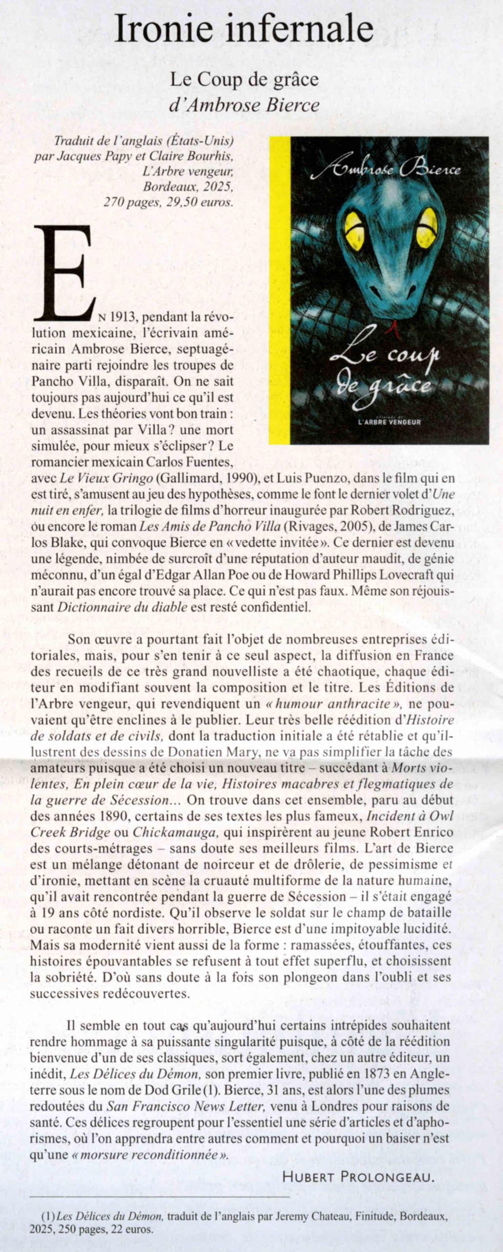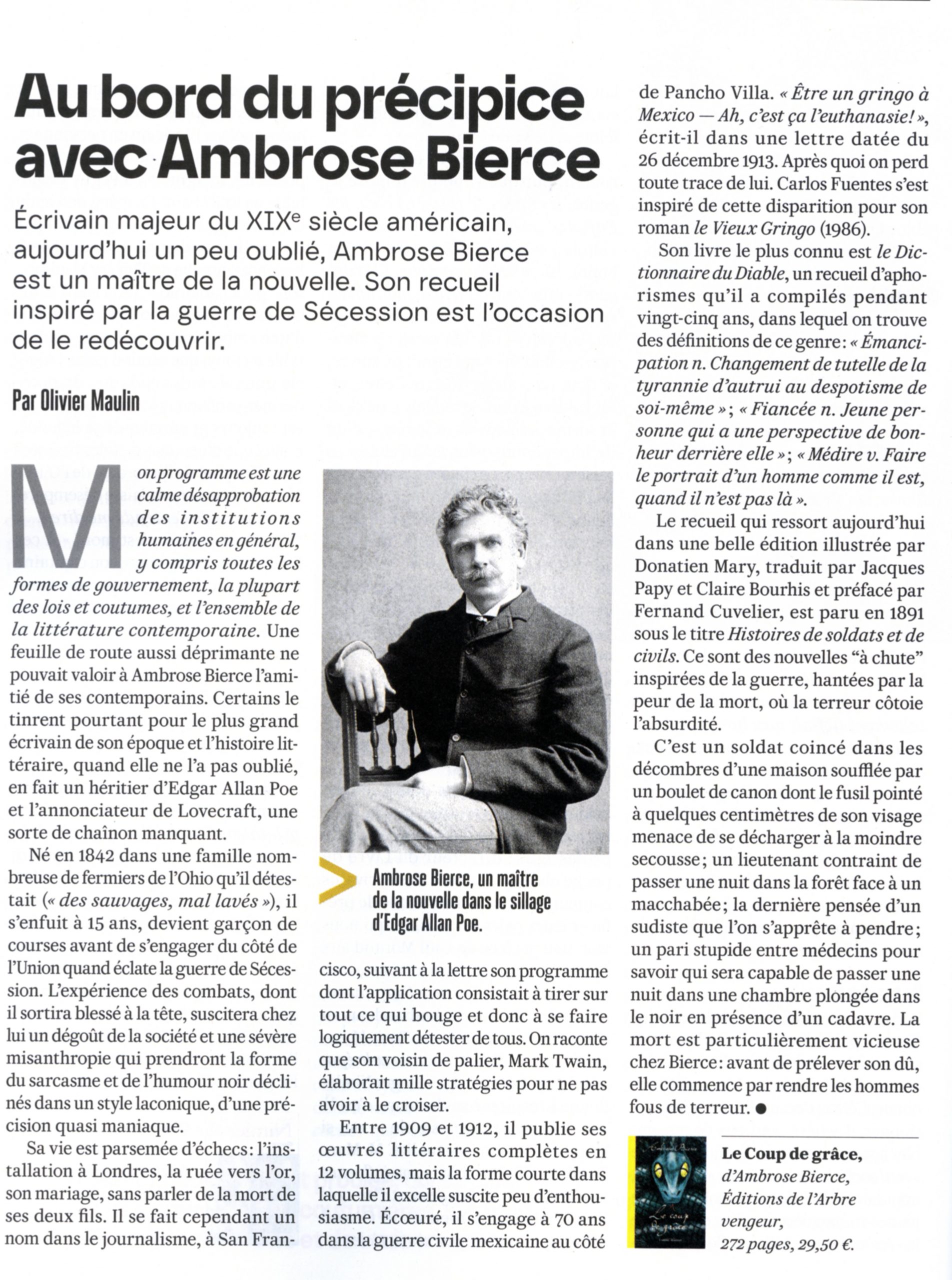 Si Ambrose Bierce continue à nous impressionner, cent ans après sa mystérieuse et romanesque disparition, c’est sans doute que son art de raconter a gardé cette stupéfiante puissance d’évocation qui est le lot des plus grands.