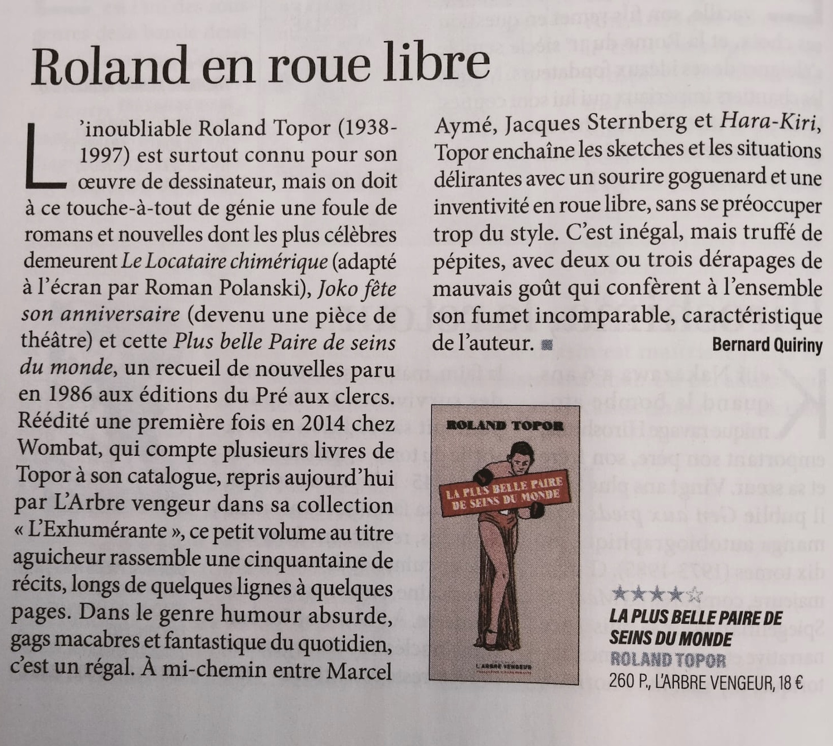 “Nous cherchons toujours l’inquiétude ou le désespoir derrière la rigolade. Dans le cas de Topor, la rigolade évoque plutôt le phénomène de l’avalanche. Elle naît de peu de chose ; en dévalant la pente, elle enfle démesurément.”
