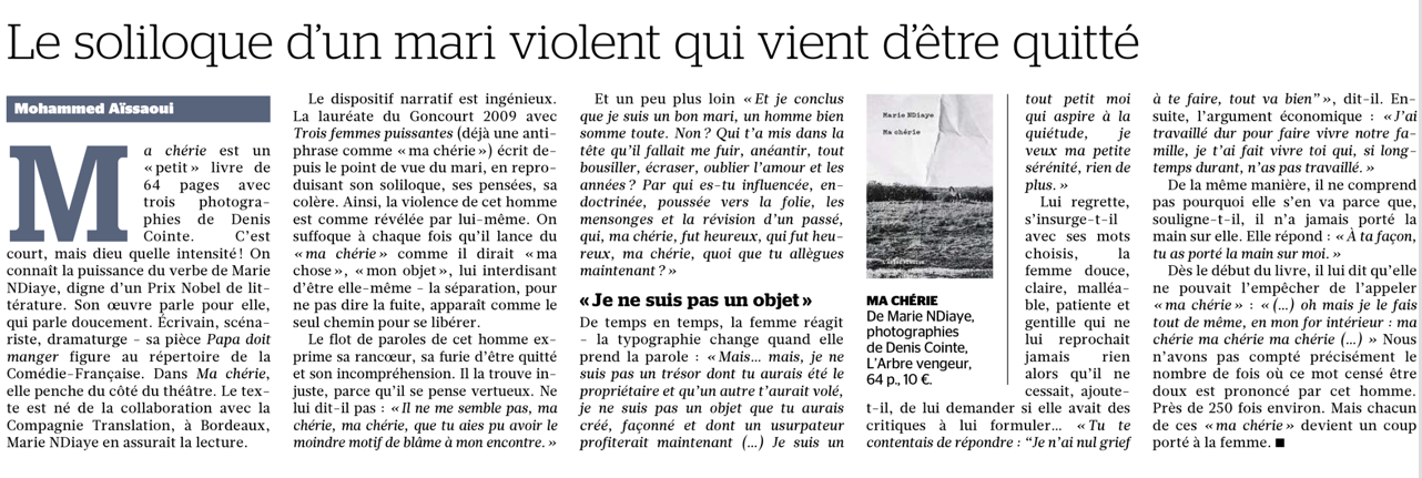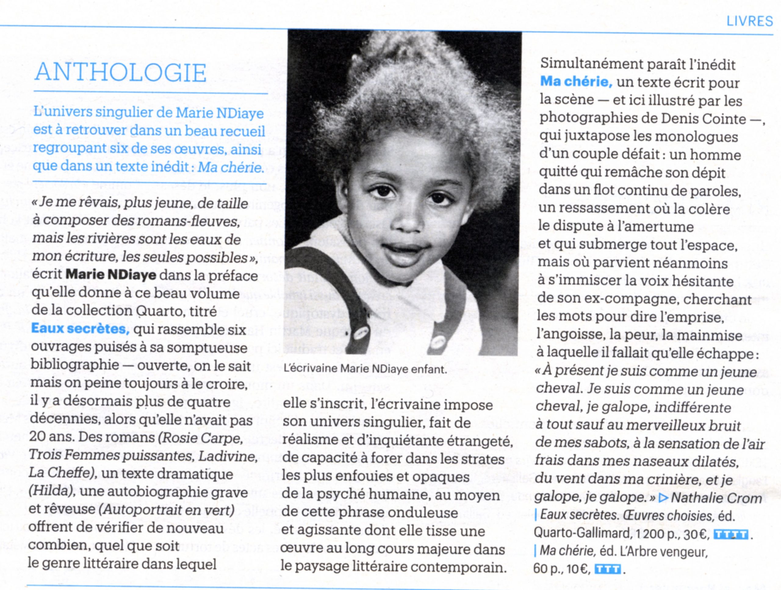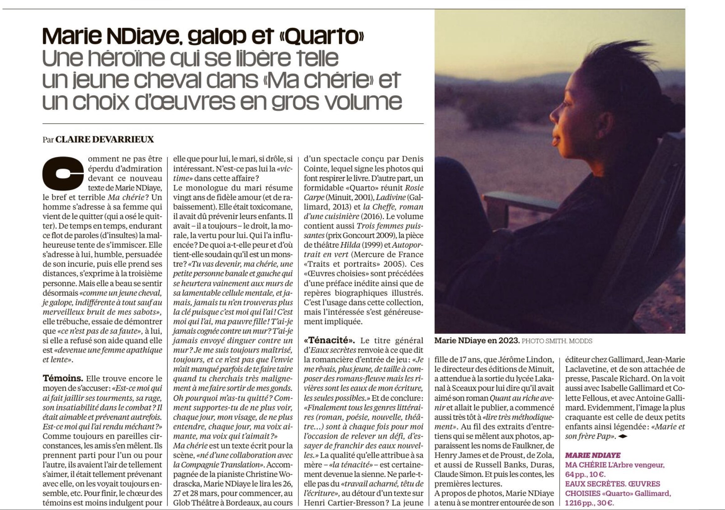 “Comment ne pas être éperdu d’admiration devant ce nouveau texte de Marie NDiaye.”