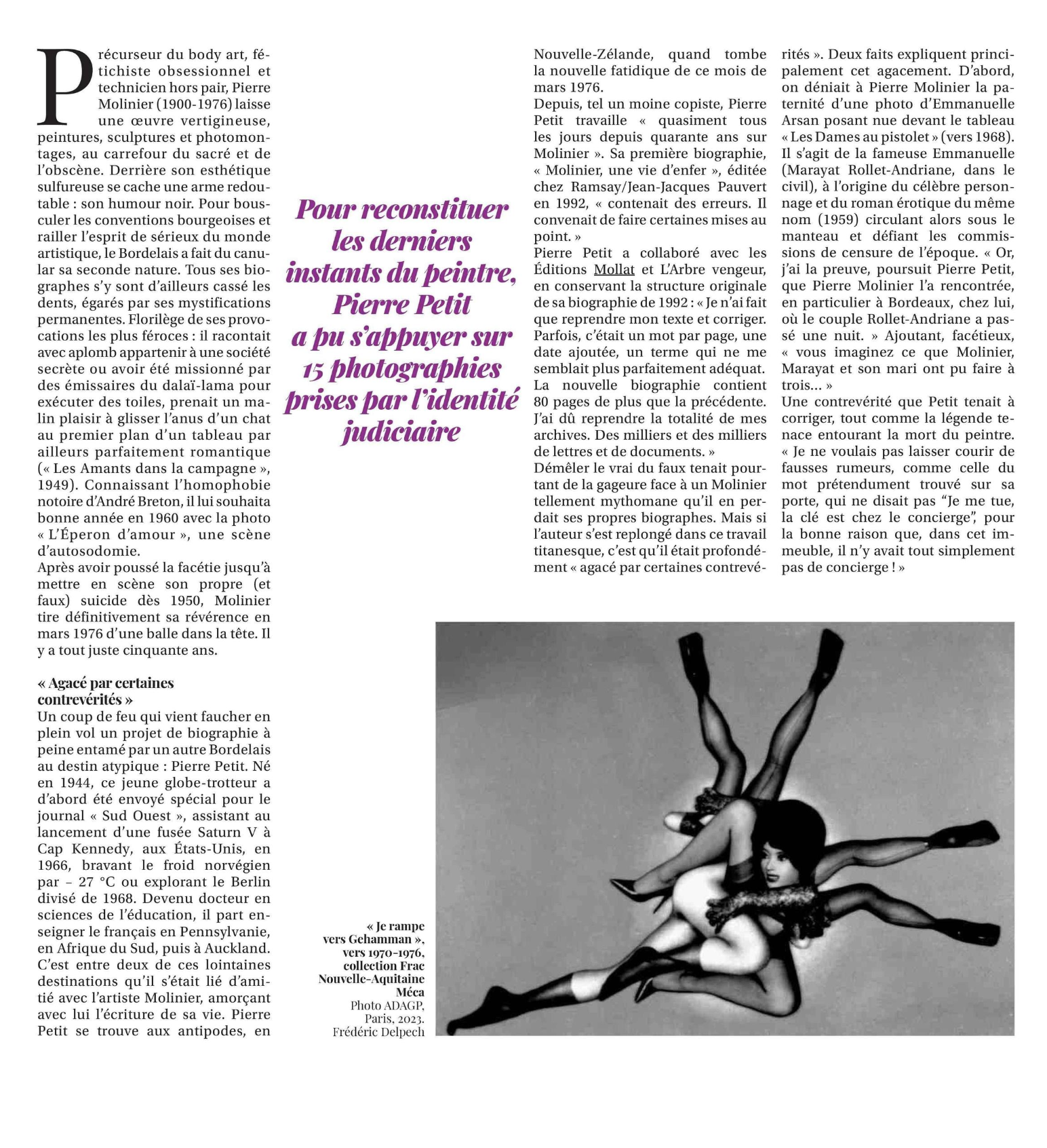 On a longtemps pris Pierre Molinier pour un artiste marginal dont les excentricités et les manies amusaient ou inquiétaient les habitants d’une ville dont il était devenu une figure. Loin de cette vision folklorique, le peintre et photographe concevait pourtant, à sa manière provocatrice et intransigeante, une œuvre de toute première importance qu’André Breton, le premier, salua avec ferveur.