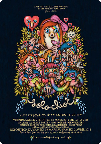 Même s’il est un peu tard pour trinquer avec l’artiste (quoique, une dernière étape étant prévue à Berlin le 6 avril prochain, avec conférence exclusive mystérieuse et en anglais), le Solo Chiot Tour d’Amandine Urruty (cf. Les couilles de Dieu) laisse actuellement des traces (colorées) un peu partout dans le monde. Il serait dommage de ne pas en profiter pour aller contempler son travail, à Paris (Galerie La place forte), à Toulouse (espace GHP), à Berlin (donc – festival Pictoplasma) et à Bordeaux (librairie La Mauvaise Réputation + Escales du Livre), où d’ailleurs elle dédicacera pour la seconde fois en quinze jours son magnifique ouvrage « Robinet d’amour » (tout juste édité aux Requins Marteaux). Un maximum de renseignement, et bien plus, vous attendent sur son site, ici.
