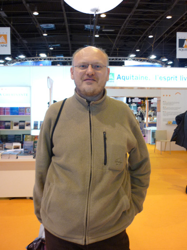 Il travaille dans l’ombre et derrière son ordinateur s’est fixé la mission de traquer tout ce qui peut paraître sur Eric Chevillard dont il a la charge du site officiel. Beaucoup d’auteurs rêveraient d’avoir un lecteur de cette trempe et de cette patience. Son nom apparaît désormais comme dédicataire du deuxième volume de L’Autofictif (L’autofictif voit une loutre, rappelons-le aux distraits) : Even Doualin a donc quitté un peu de son anonymat et appartient désormais au corpus chevillardien. Et comme cet homme discret a aussi un visage et qu’il nous a aimablement rendu visite au Salon du Livre de Paris, voilà son image jetée sur la toile : qu’il nous pardonne, et qu’il soit remercié pour son travail !