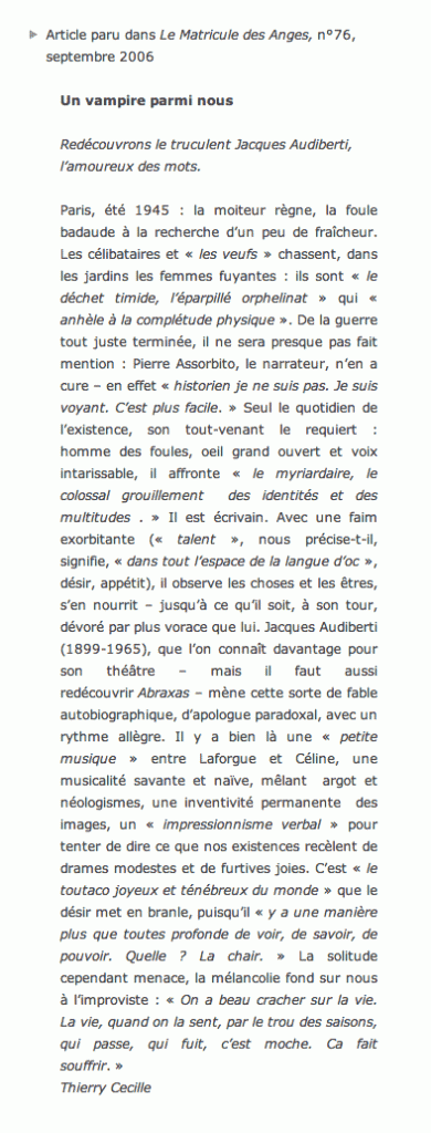 Plus que beaucoup d’écrivains, Jacques Audiberti s’est interrogé sur cette malédiction prodigieuse qui distingue les créateurs du commun. Dans Talent (1947), il nous fait vivre de l’intérieur le parcours de l’un de ces « criminels anthropophages » plongé dans un petit univers, l’hôtel Pompelane, à la fois misérable, sublime et cocasse.