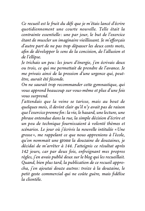 Dans le recueil que vous allez lire, si l’ivresse est au rendez-vous, ce n’est pas celle des flacons de Raymond Queneau. Car quand Jean-Louis Bailly se met au comptoir, c’est pour aligner de courtes nouvelles, à savourer à la douzaine et sans modération. On pourra néanmoins choisir, par prudence ou par plaisir, de les déguster au rythme imaginé par leur auteur : une par jour pendant cinq mois. L’occasion quotidienne de mesurer l’étendue du registre d’un écrivain aussi à l’aise dans le fantastique et le réaliste que l’humoristique, le policier ou le satirique. Généreux avec son talent, il offre même in fine à ses lecteurs un petit geste commercial avec une douzaine supplémentaire.