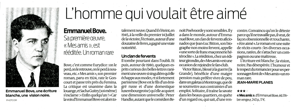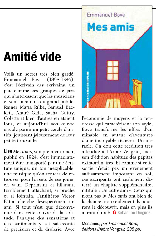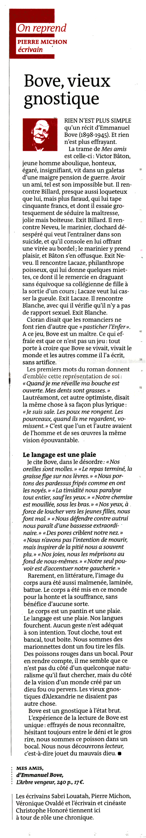 “L’écriture est blanche; la vision noire. Pas désespérée. L’humour et le respect du romancier pour ses personnages font de “Mes amis” un roman rare.”
