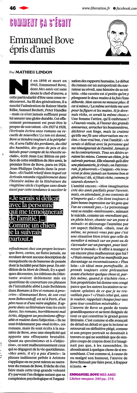 “C’est comme si, à cause de ou malgré son humour, l’œuvre de Bove finissait par faire peur, à frapper si juste.”