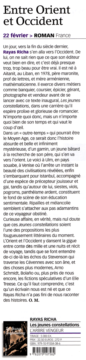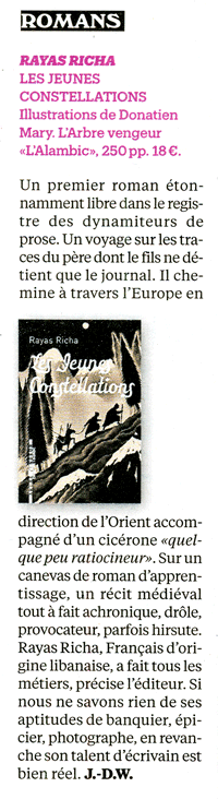 Ce mirage, le jeune héros de ce premier roman éblouissant va le vivre dans l’espoir de retrouver son père dont il ne connaît que le journal intime cynique et scabreux. Accompagné d’un philosophe bavard et d’un baudet silencieux, le garçon, qui aspire naïvement au bonheur, entreprend la traversée d’une Europe ravagée et dangereuse jusqu’à Venise, le port de tous les possibles. Illuminé d’images saisissantes, Les Jeunes Constellations nous transporte dans un moyen âge étrange, roman d’apprentissage qui se double d’une quête aussi esthétique que personnelle. Déployant un humour parcouru de mélancolie, Rayas Richa impose avec vigueur une langue et un univers qui le désignent d’emblée comme un auteur d’importance.