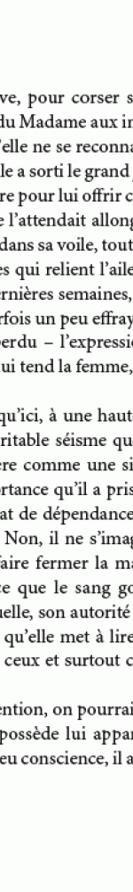 “Cet antimoderne qui finira par l’être tout à fait à force de ne s’en plus préoccuper suit sa ligne. Celle des secrets, du réel congédié, des corps emblasonnés. La seule qui vaille.”