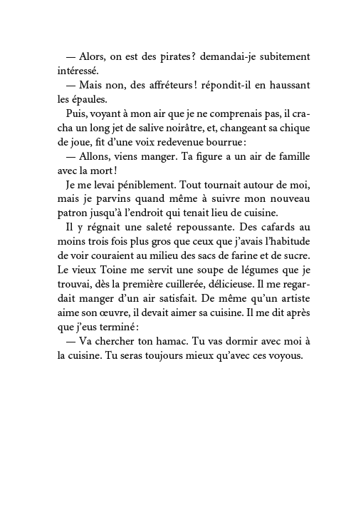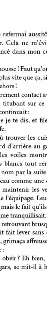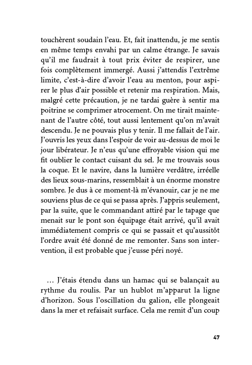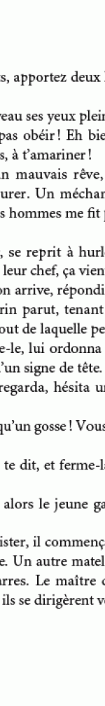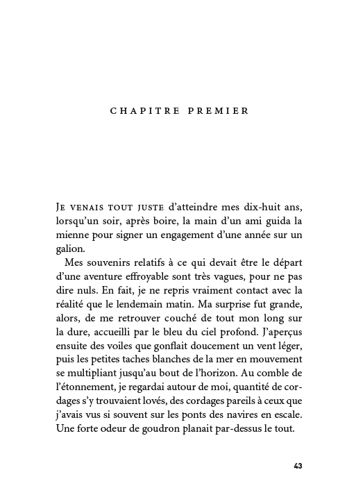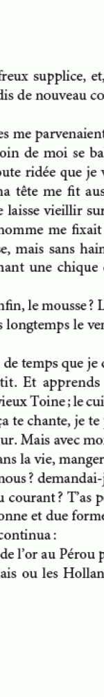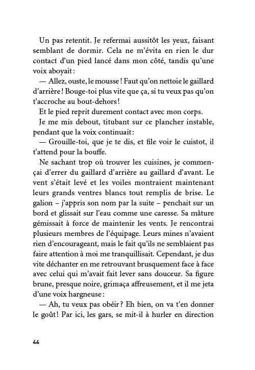 Mousse embarqué de force sur un bateau où l’équipage ne lui épargne rien, le narrateur de cette histoire raconte sa vie en mer, entre les privations, les sévices et la cruauté des marins, mais sous la protection du cuistot. Ce dernier comprend vite qu’avec le vent qui tombe se préparent des temps terribles et que la vie sur un galion immobile va devenir un enfer.