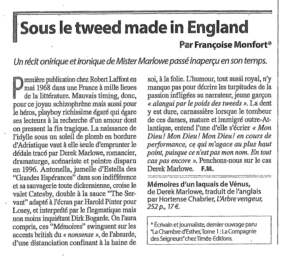 Avec ces Mémoires, Derek Marlowe, écrivain anglais disparu en 1996, a imaginé un roman aussi féroce que compassionnel qui mériterait mieux que le succès posthume : la reconnaissance de ceux pour qui la littérature a, seule, le pouvoir de transmettre l’indicible et sublime difficulté de vivre et d’aimer.