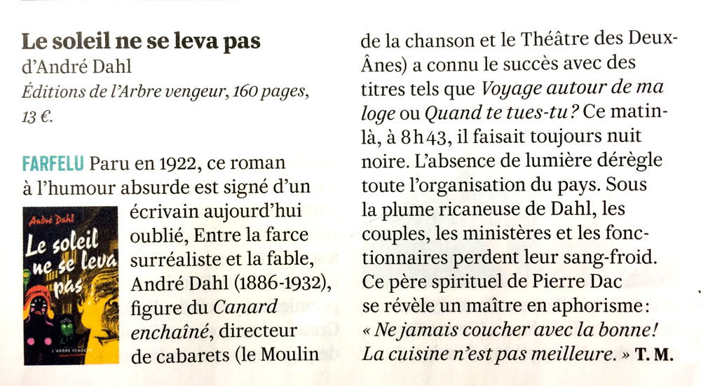 La nuit semble n’en plus finir sur Paris ce matin. Terrible constat pour les habitants de l’immeuble que nous allons découvrir car ils ne sont pas prêts à devenir les héros d’un roman d’anticipation et à se passer du soleil. Ils sont en revanche parfaits pour occuper la scène comique que dresse André Dahl qui va s’en donner à cœur joie avec ces Parisiens déboussolés en nous faisant vivre vingt-quatre heures de la vie d’une ville où la lâcheté des gouvernants s’épanouit, où les uns choisissent la contrition, les autres le plaisir, et où tout s’enchaîne frénétiquement.