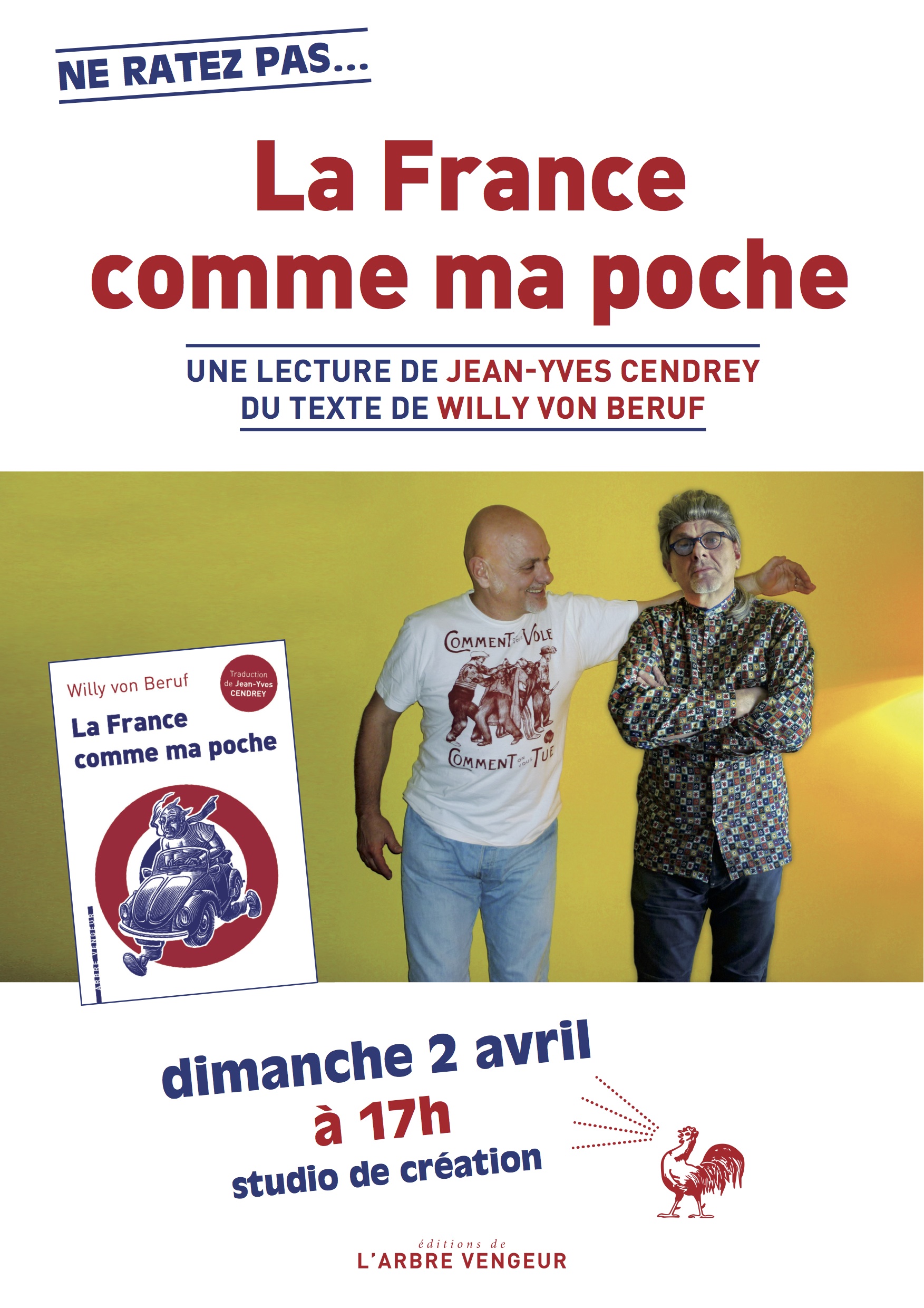 Première montrée sur scène pour Willy von Beruf aka Jean-Yves Cendrey qui se produira lors de l’Escale du Livre de Bordeaux le dimanche 2 avril à 17h à l’Atelier de création du TNBA. Une lecture mise en scène de La France comme ma poche devant quelques Girondins curieux et en compagnie de deux comparses inattendus.
