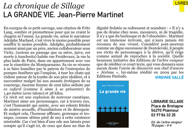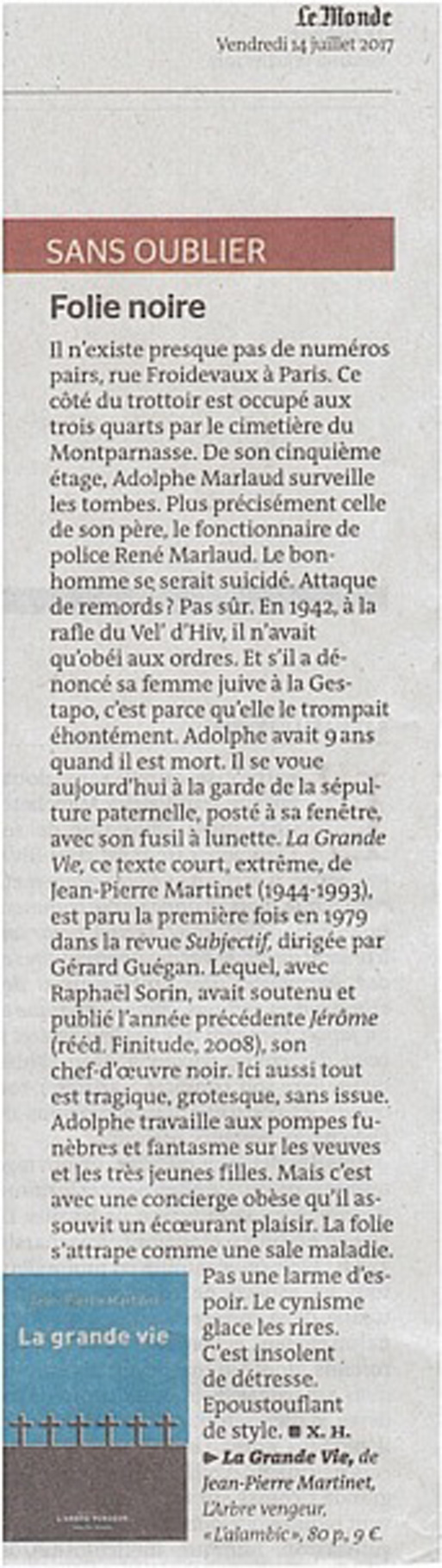 Jean-Pierre Martinet, l’auteur de ce texte halluciné paru en 1979, est mort oublié en 1993 : on a redécouvert depuis le sombre génie et la folie magnifique d’une œuvre sans équivalent. Avec ce court livre, c’est son humour qui explose : il est d’un noir détergent.