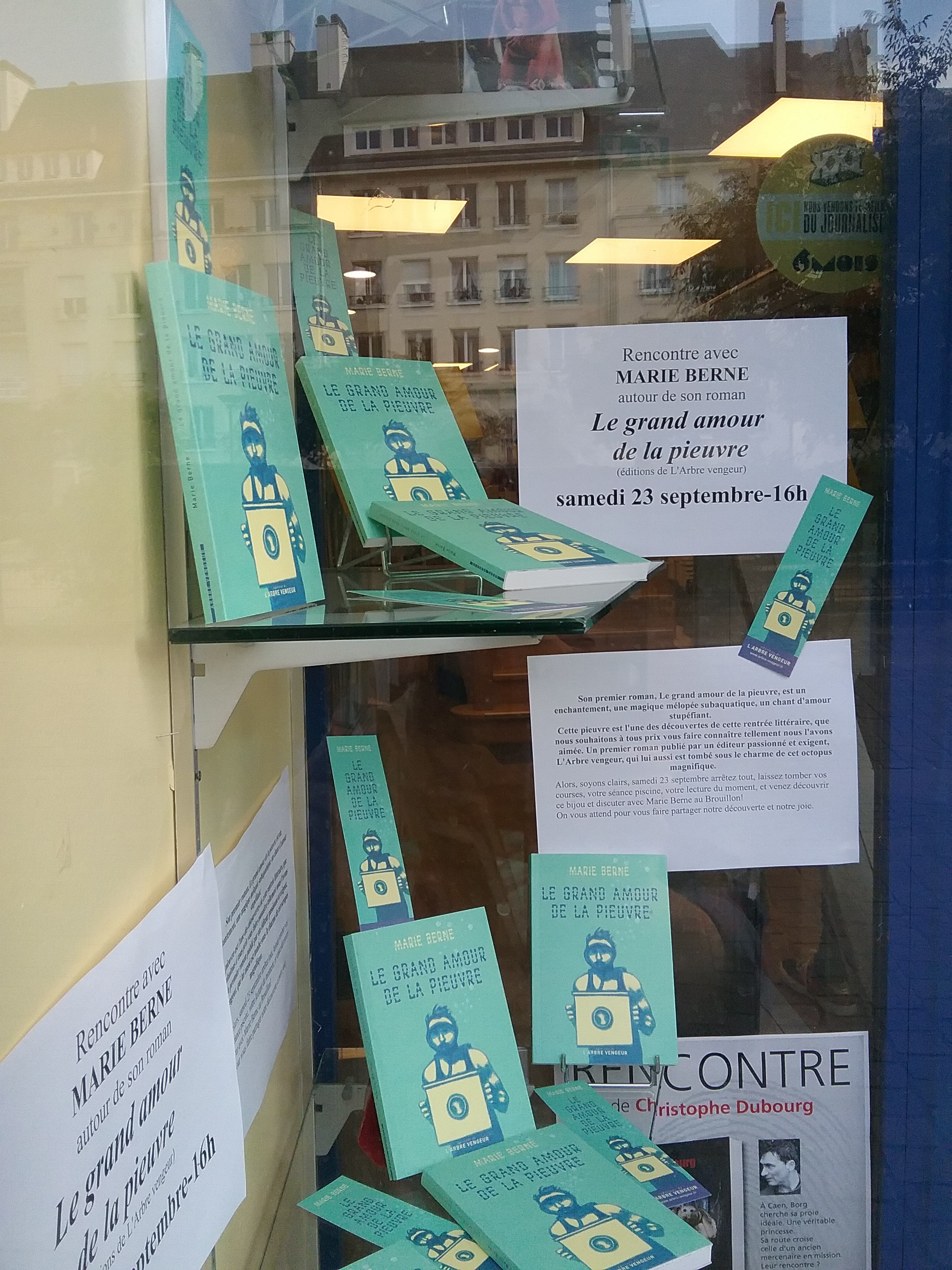 Pour sa première sortie hors de la capitale, la pieuvre de Marie Berne se déplacera jusqu’à Caen samedi 23 septembre pour y rencontrer de fiers Normands. Accueillie par Valérie Barbe, la responsable de la littérature au Brouillon de Culture, belle librairie du centre ville, elle déploiera au beau milieu de l’après-midi (16h) ses tentacules pour les nouer autour des gorges les plus enclines à se livrer.