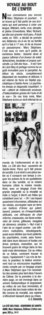 À Sainte-Anne, incroyablement racontée par Marc Stéphane dans sa Cité des fous, on n’écoute plus les sempiternels refrains des internés, fussent-ils surnommés Voltaire et soumis au régime des « tranquilles ». Et pourtant… une bouteille d’alcool oubliée, un petit écart dans les règles, et vous voilà plongé dans un fait divers horrifique et ahurissant.