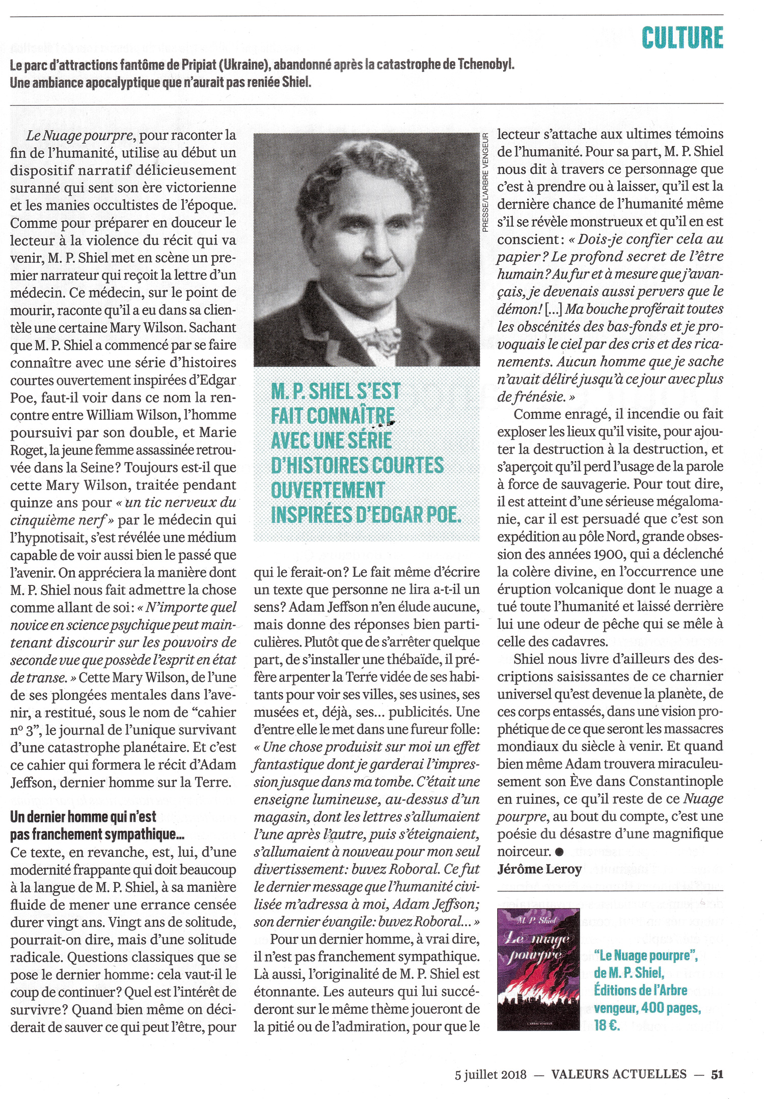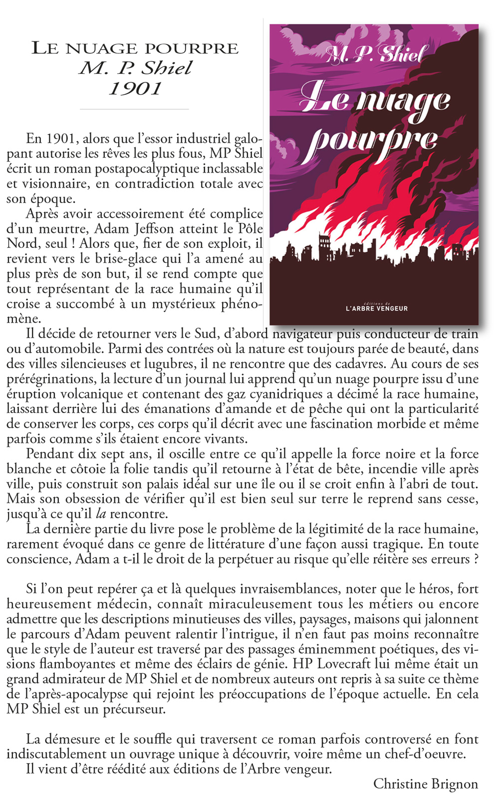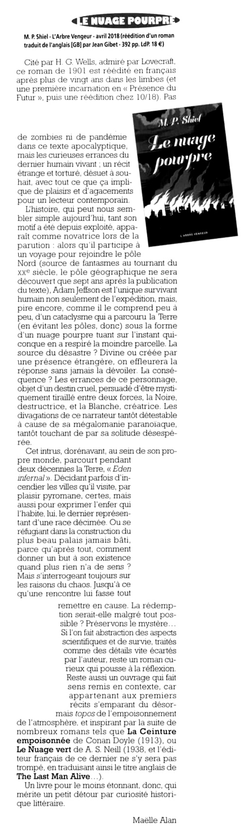 “Totalement envoûtant, “Le Nuage pourpre” frappe par sa modernité et la manière qu’a M.P. Shiel de bâtir sans effets de manche un univers apocalyptique digne des tableaux de Jérôme Bosch”