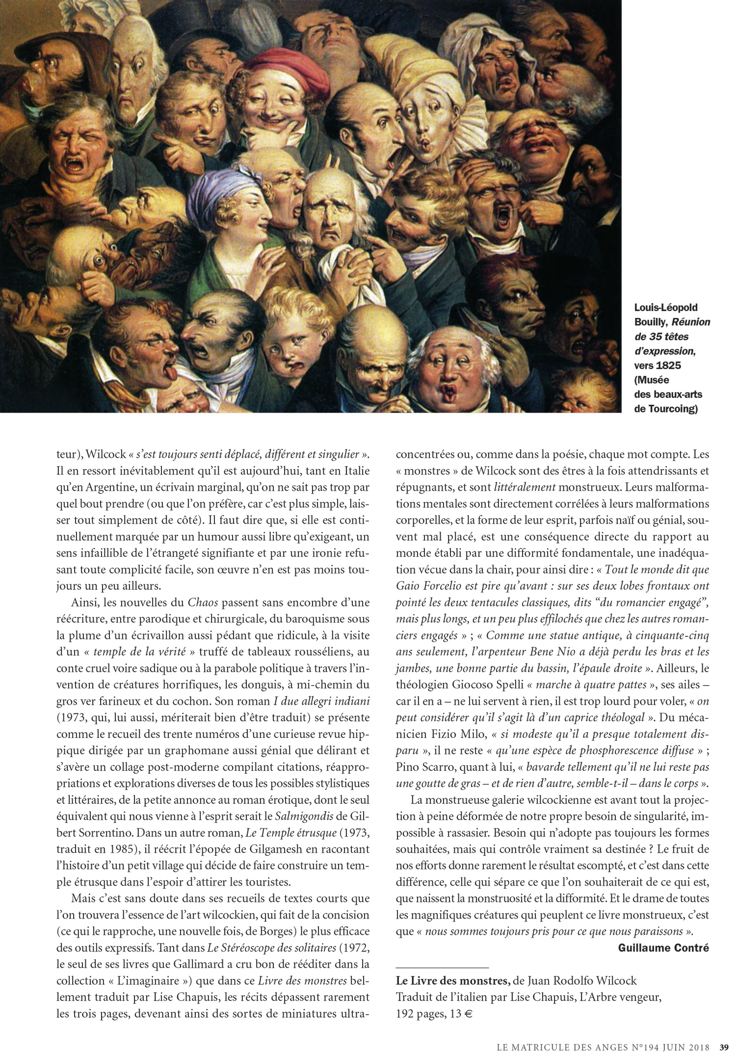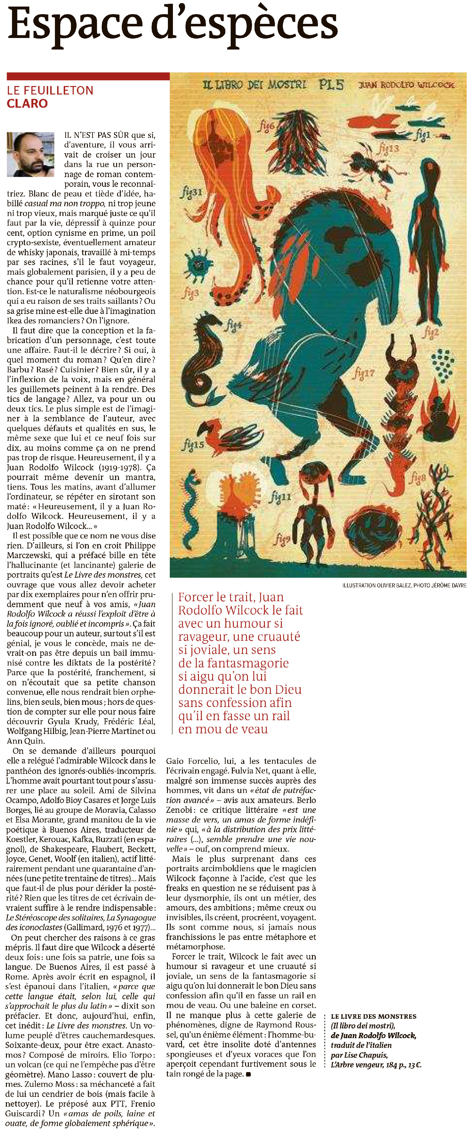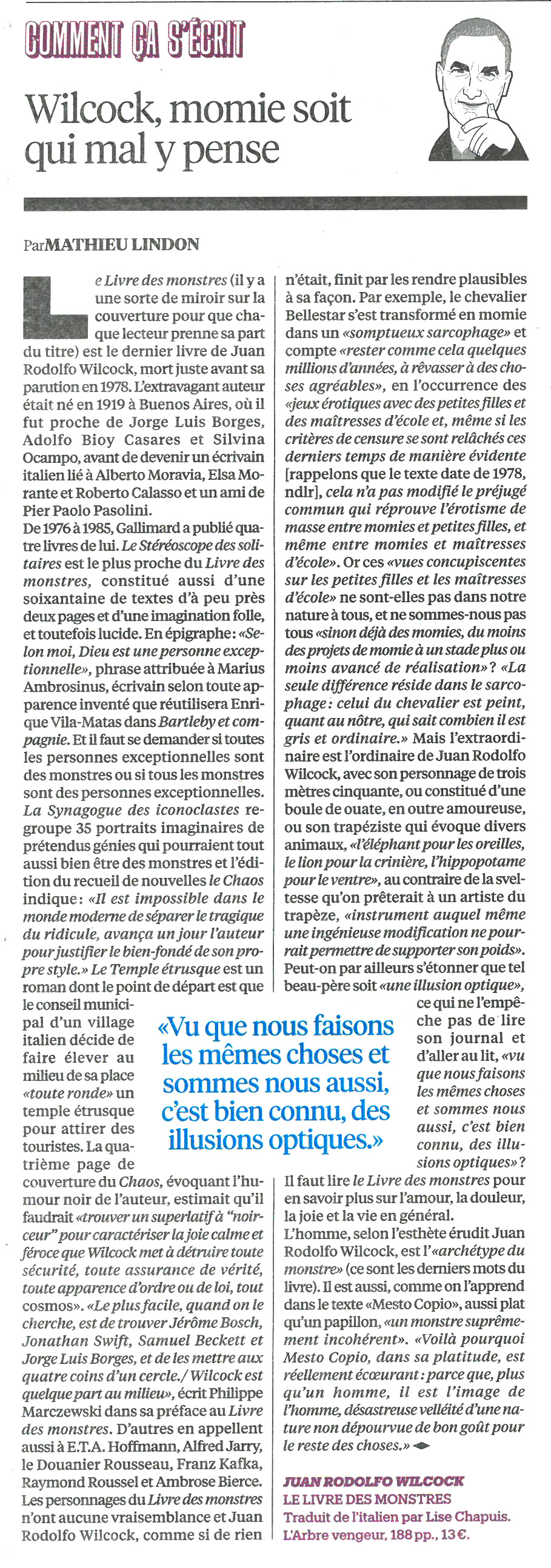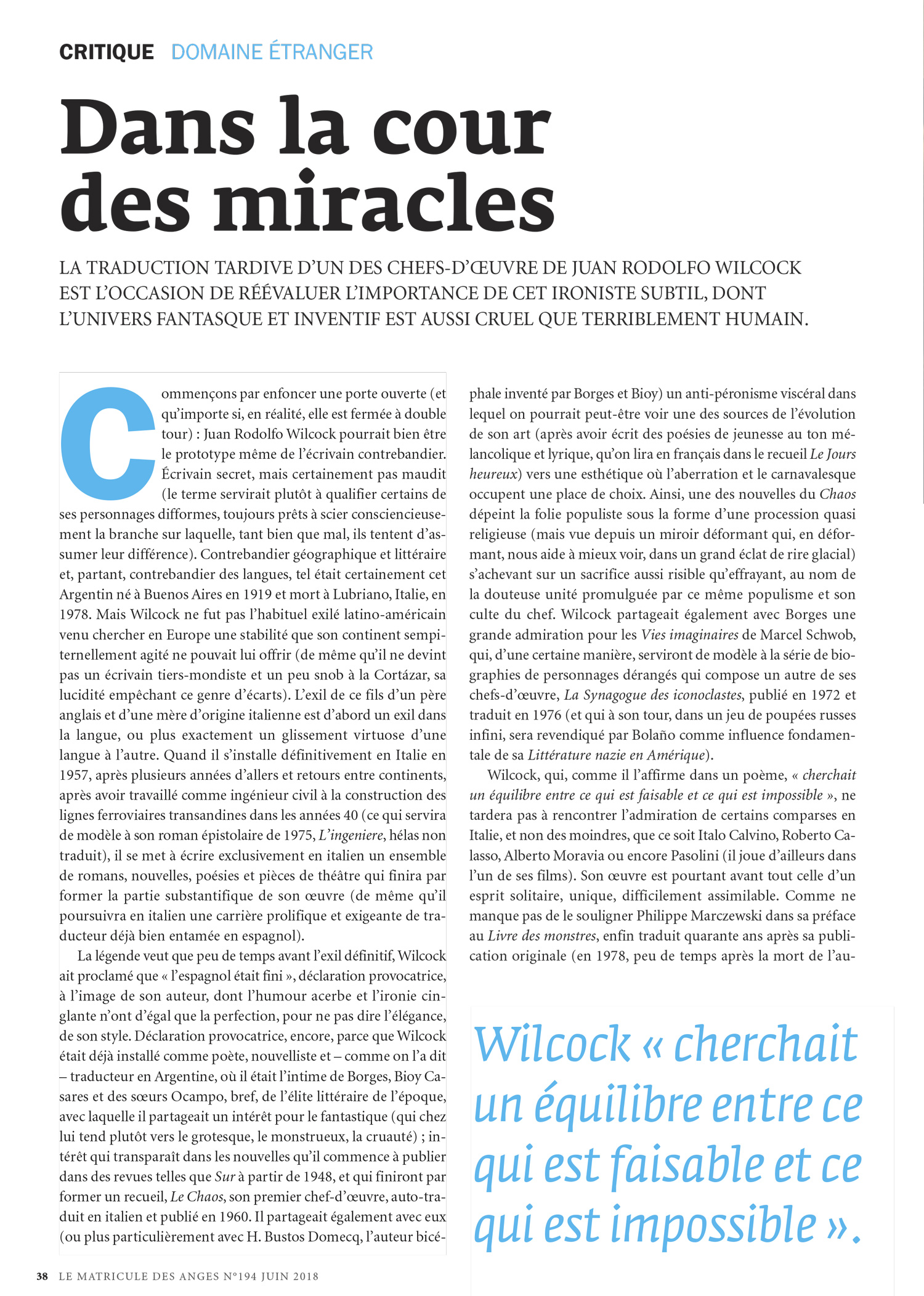 “La traduction tardive d’un des chefs-d’oeuvre de Juan Rodolfo Wilcock est l’occasion de réévaluer l’importance de cet ironiste subtil, dont l’univers fantasque et inventif est aussi cruel que terriblement humain.”