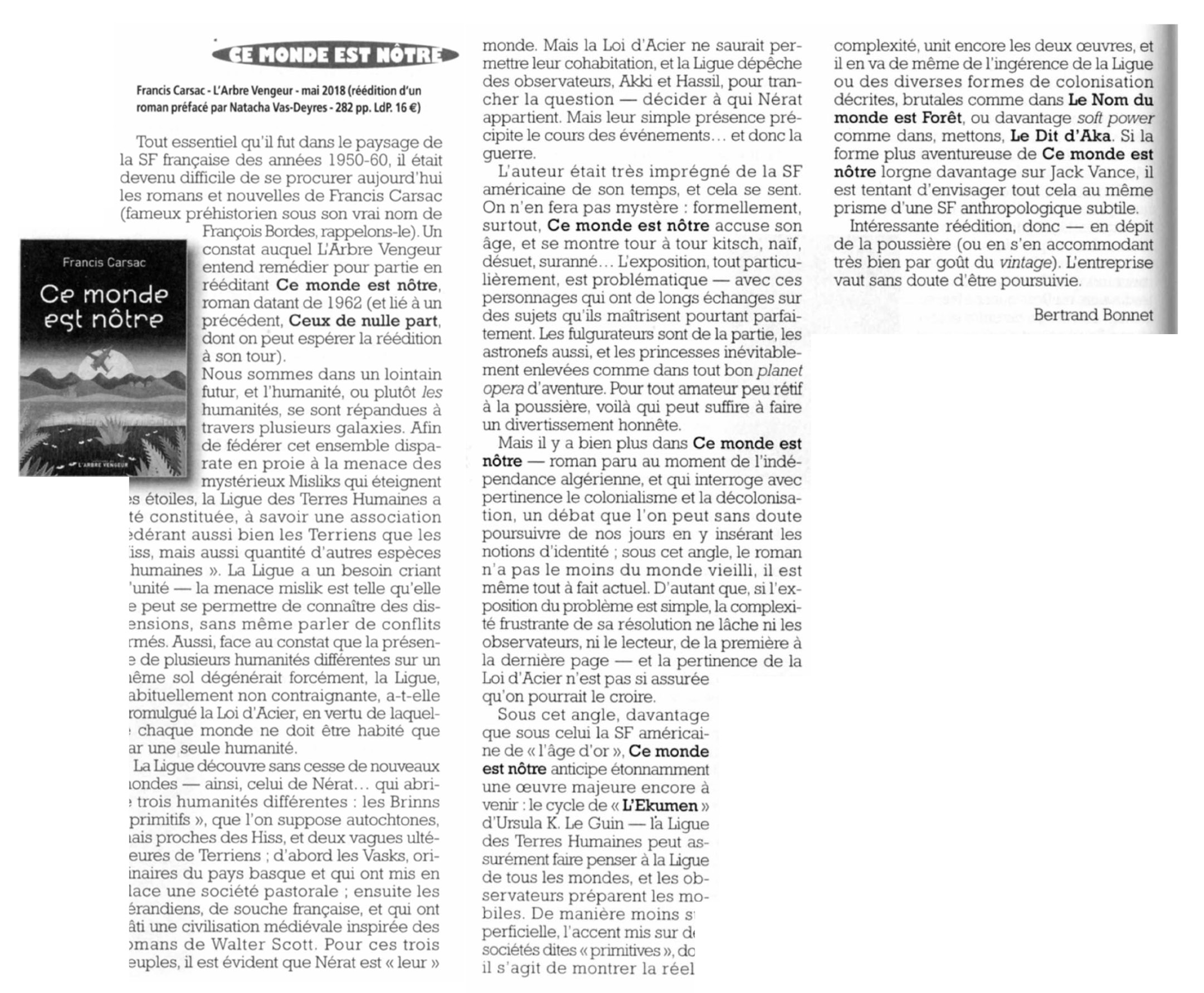 “Une perle de l’imaginaire à lire absolument, car, en plus d’être un space opera magistral, rempli d’aventure, de guerre et de personnages attachants, Ce Monde est Nôtre est un chef d’oeuvre de subtilité et un véritable hymne à la tolérance.”