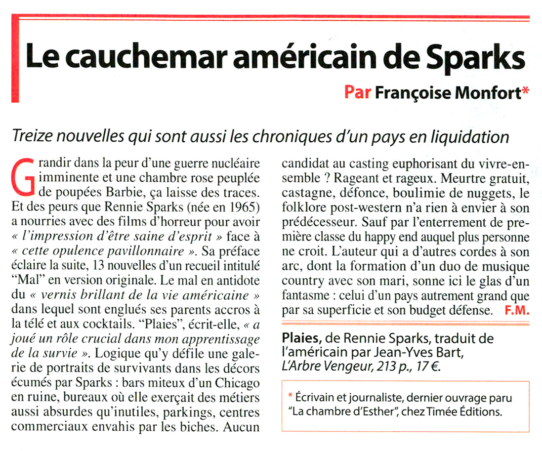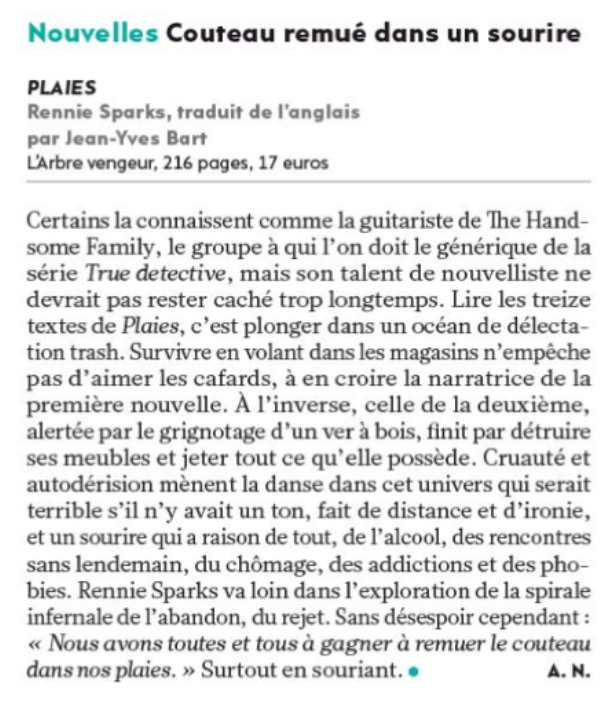 “Le style de Rennie Sparks se marie parfaitement aux histoires qu’elle raconte : désespérées et implacables et les moments de grâce des protagonistes n’en sont que plus prenants et plus beaux. MR”