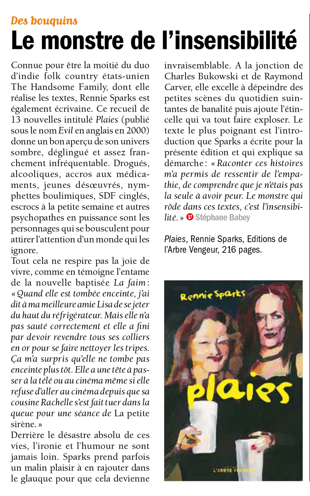 “À la jonction de Charles Bukowski et de Raymond Carver, Rennie Sparks excelle à dépeindre des petites scènes du quotidien suintantes de banalité puis ajoute l’étincelle qui va tout faire exploser.”