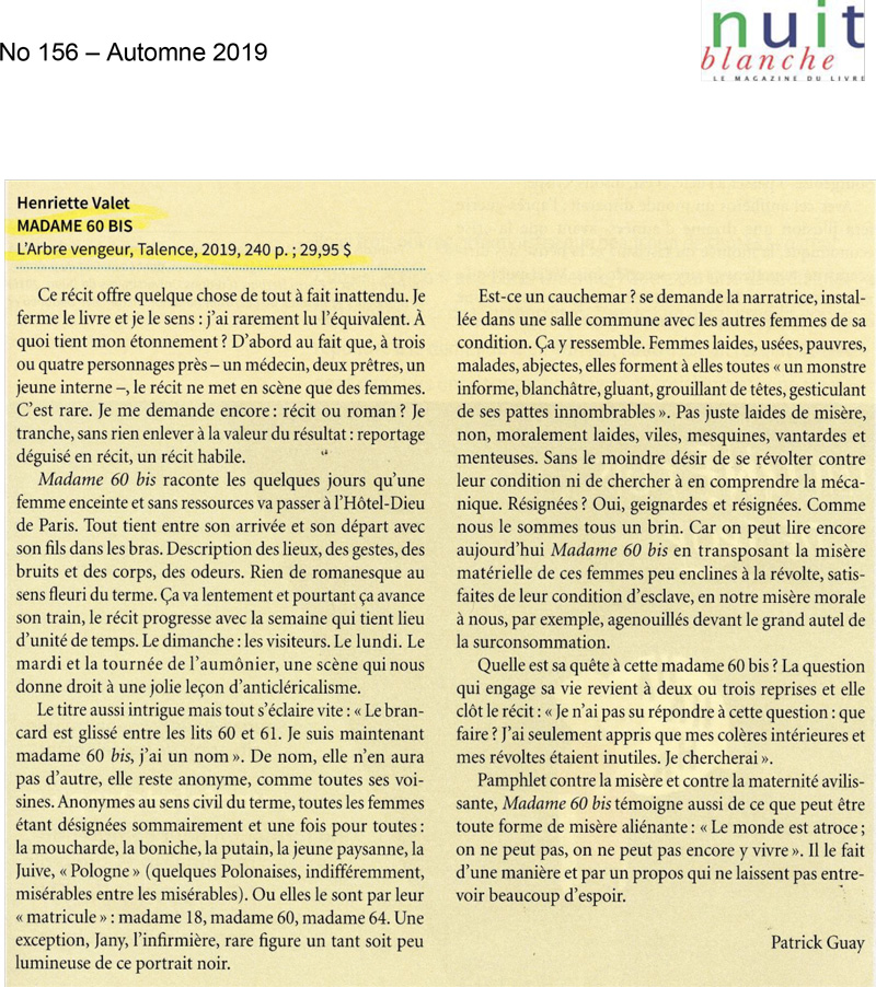Quelques jours de la vie d’une femme sur le point d’accoucher à l’Hôtel-Dieu de Paris au milieu des misérables, des abandonnées, des nécessiteuses de toutes nationalités qui n’ont droit qu’à un numéro et à la vague compassion de bourgeoises venues faire leur bonne action. Confidences ou vacheries, petitesses et héroïsme invisible, ce sont les échos d’une souffrance morale et physique que raconte, dans une langue vive et en colère, une anonyme qui a eu droit à un lit supplémentaire et un bis comme matricule en attendant la délivrance. Instruite, lucide et vigilante, elle sait de quel système politique et de quels enjeux économiques participe le culte de la maternité en régime capitaliste. Poignant, scandaleux, impitoyable, ce livre est un cri qui ne cède rien et nous touche encore. Écrit par une femme dont on ignore le destin mais dont on sait l’engagement au côté des défenseurs du prolétariat, Madame 60 bis est resté trop longtemps ignoré depuis sa parution dans les années 30. Henriette Valet reste une inconnue, à reconnaître sans attendre.