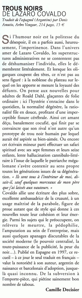 Longer le vide. Tous les personnages de Lazaro Covadlo, qui s’est taillé grâce à ce livre une place unique dans les Lettres hispaniques, pratiquent cet exercice, cet art de vivre ou survivre au bord des trous noirs qui s’ouvrent devant eux. Mais ce qui devrait être un carrousel de tragédies individuelles devient, par la folie contenue et l’humour ravageur de cet auteur argentin, une suite trépidante de contes insolites. Histoires de chutes, de fuites, d’écarts, rencontres avec le Mal, ces nouvelles déploient leur charme inquiétant et nous font effleurer les mystères de consciences ébranlées. Elles nous invitent, le temps d’un instant, à contempler l’abîme. Bienvenu dans le monde merveilleux et vertigineux d’un astronome unique de la littérature contemporaine.